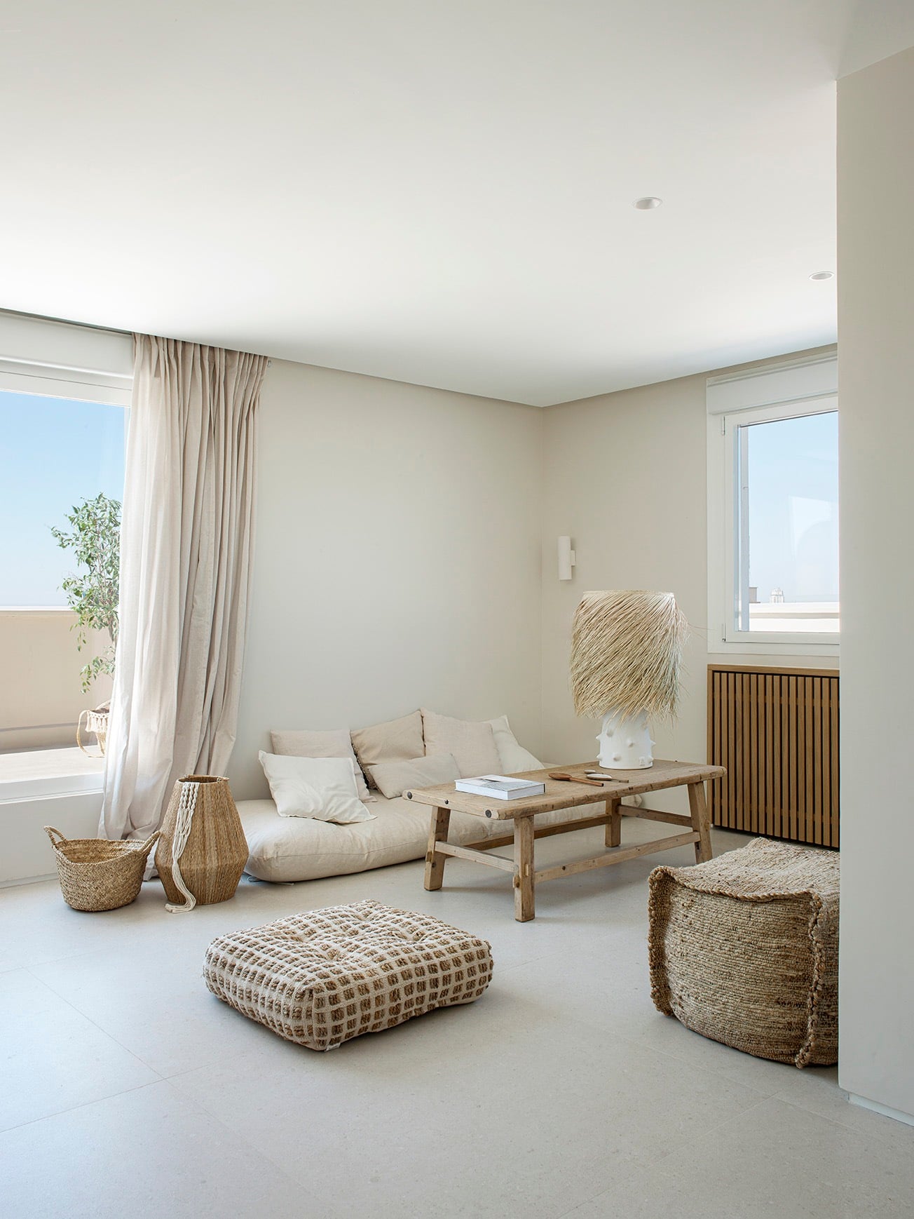 Una vez más, los materiales utilizados en este salón de diseño contribuyen a crear el lienzo idóneo para posicionar el resto de elementos y crear ese minimalismo cálido característico de las creaciones de Michelle. Se genera de esta forma un ambiente calmado y sencillo perfecto para descansar.