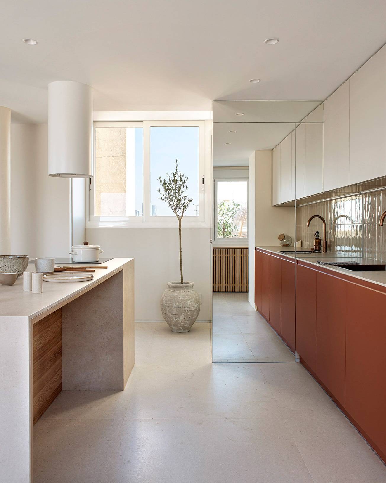 El uso del porcelánico de gran formato para dar continuidad al suelo y la utilización del espejo como revestimiento para generar más amplitud en la zona de la encimera, consiguen dar más presencia y unidad a esta cocina de diseño.