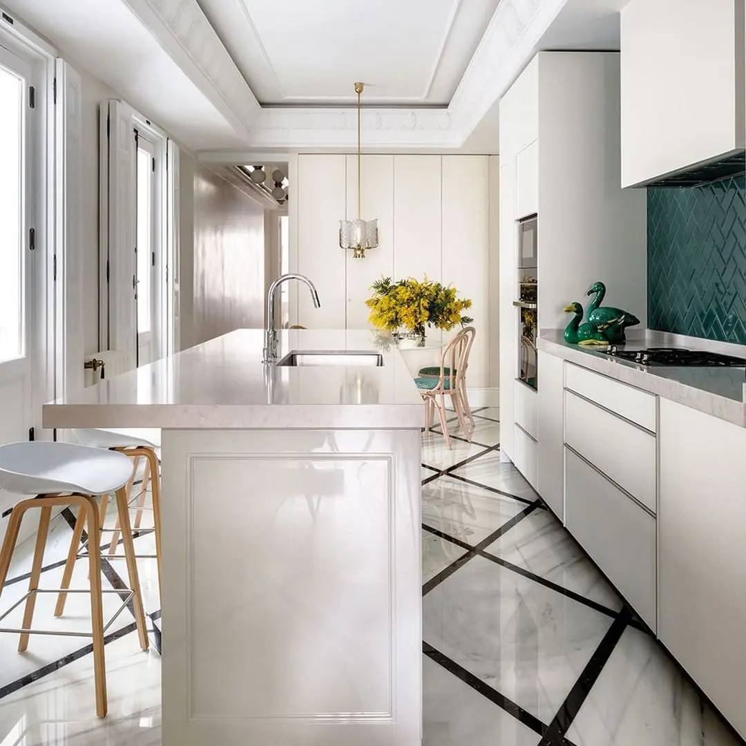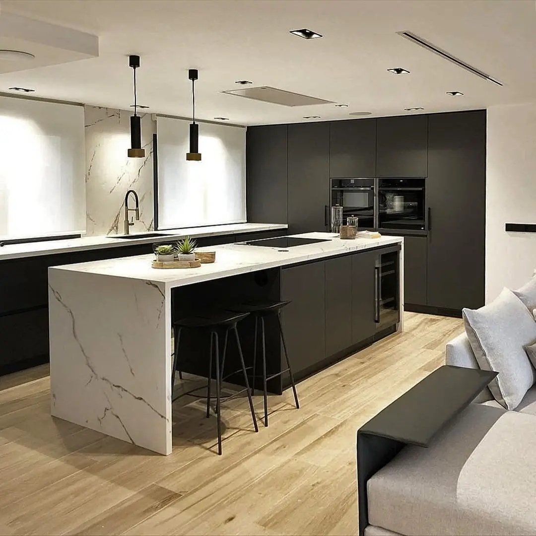 Asentada sobre la elegancia que le proporcionan los tonos blancos y negros, esta cocina exclusiva con isla central en porcelánico efecto mármol destaca por su diseño minimalista y su gran almacenamiento oculto.
