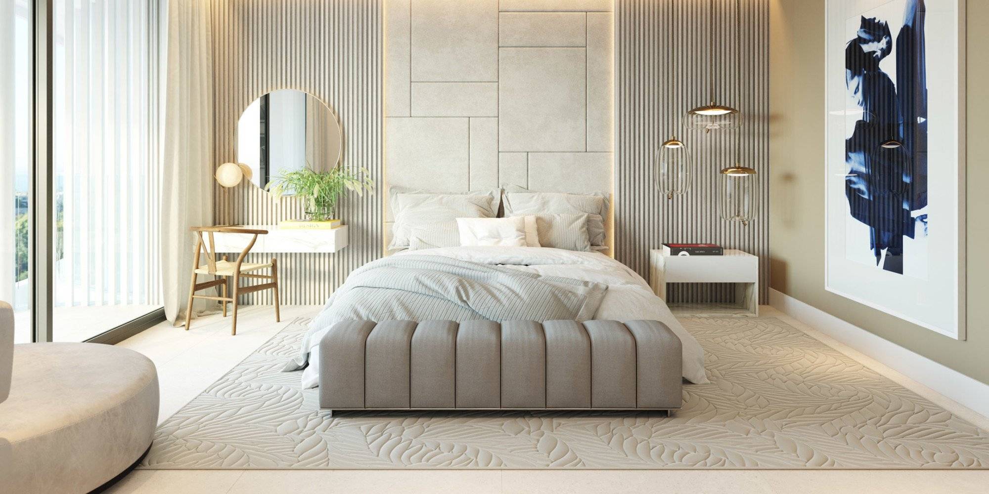 Con un marcado estilo clásico-contemporáneo, este dormitorio exclusivo nos ofrece una sensación de relajación y calma gracias a la gama de tonos claros que se ha elegido y a las formas y texturas que componen la cama y el banco. Las mesitas precisamente rompen estas formas redondeadas y se unen a las líneas rectas que dominan la composición.