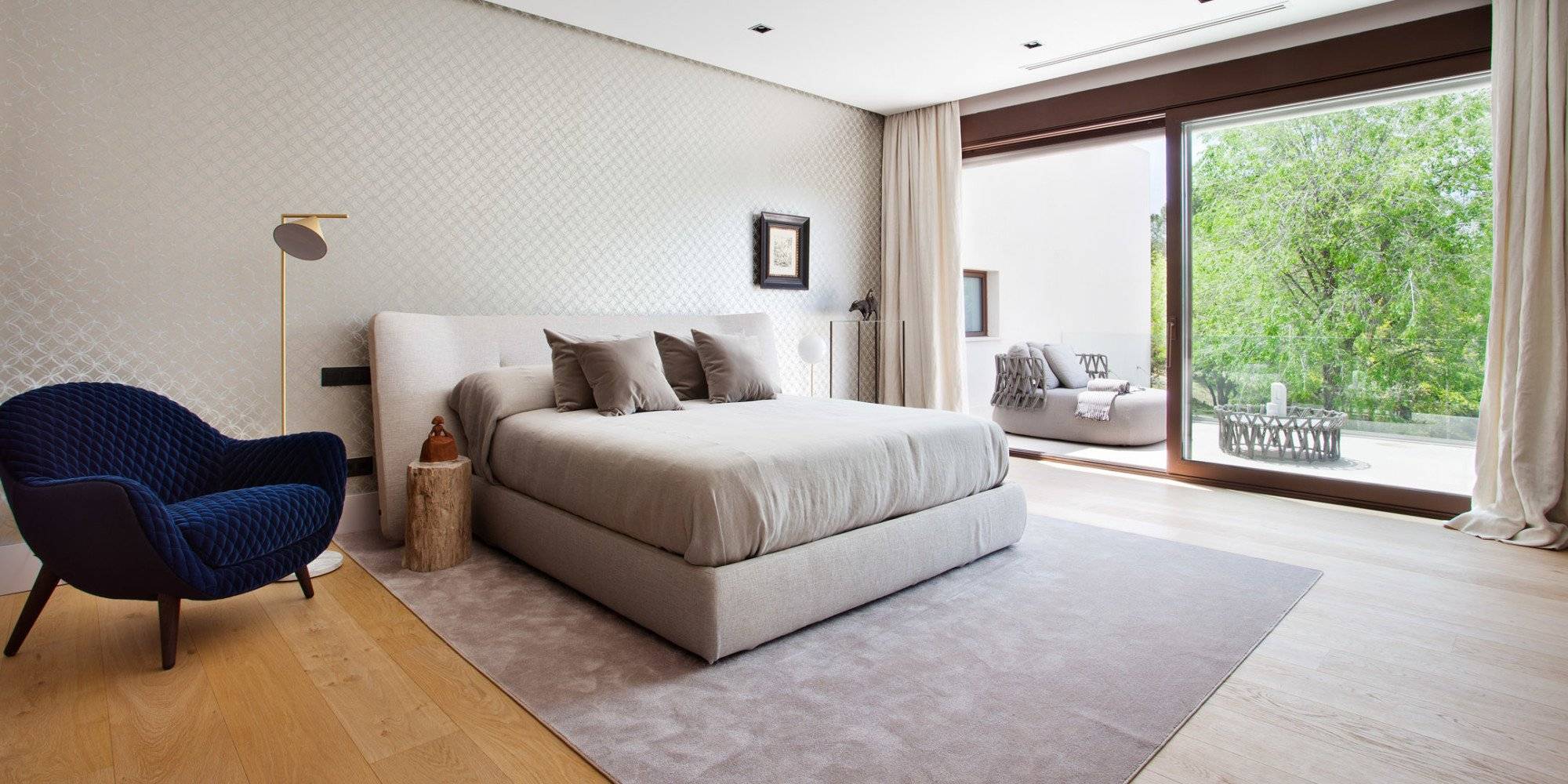 Finalmente nos encontramos con una composición muy contemporánea que se ejemplifica muy bien en la cama de diseño y la mesilla de noche. Ambos elementos apuestan por las formas suaves y redondeadas para dar calma y dinamismo a la estancia.