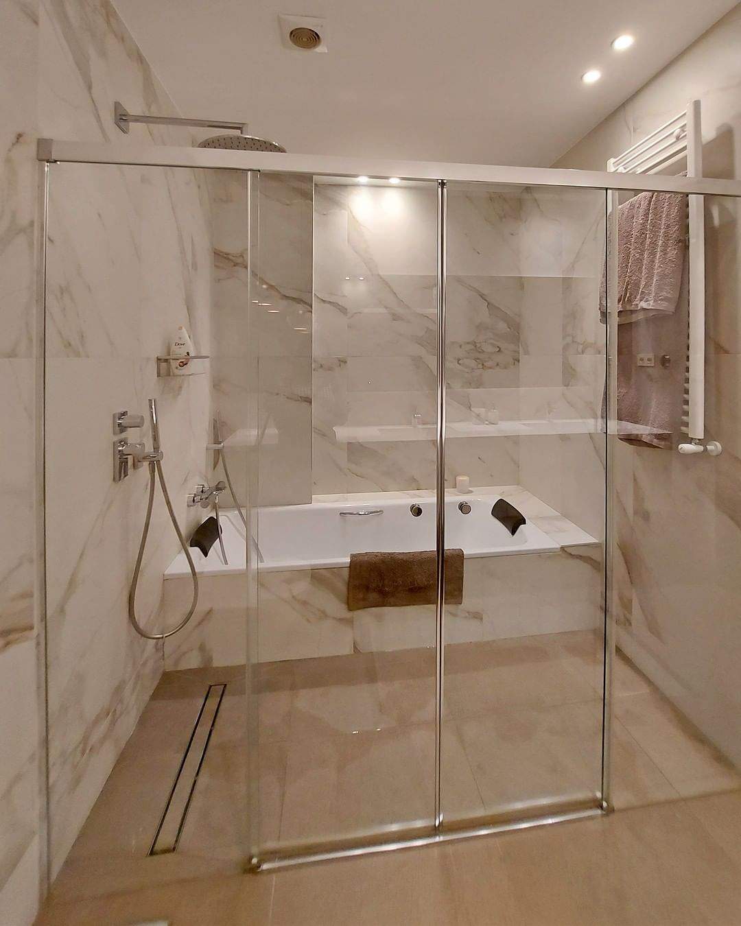 Este rincón es el lugar perfecto para relajarte gracias a la convivencia de una gran bañera de diseño, mimetizada con el material de las paredes, y de una ducha contemporánea incorporada en el mismo suelo del baño.