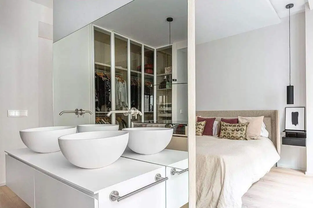 Este baño de diseño unido a la habitación principal destaca por sus líneas contemporáneas; el contraste entre los lavabos y el mueble principal; y la elección de unos tonos neutros que encajan con el resto del espacio.