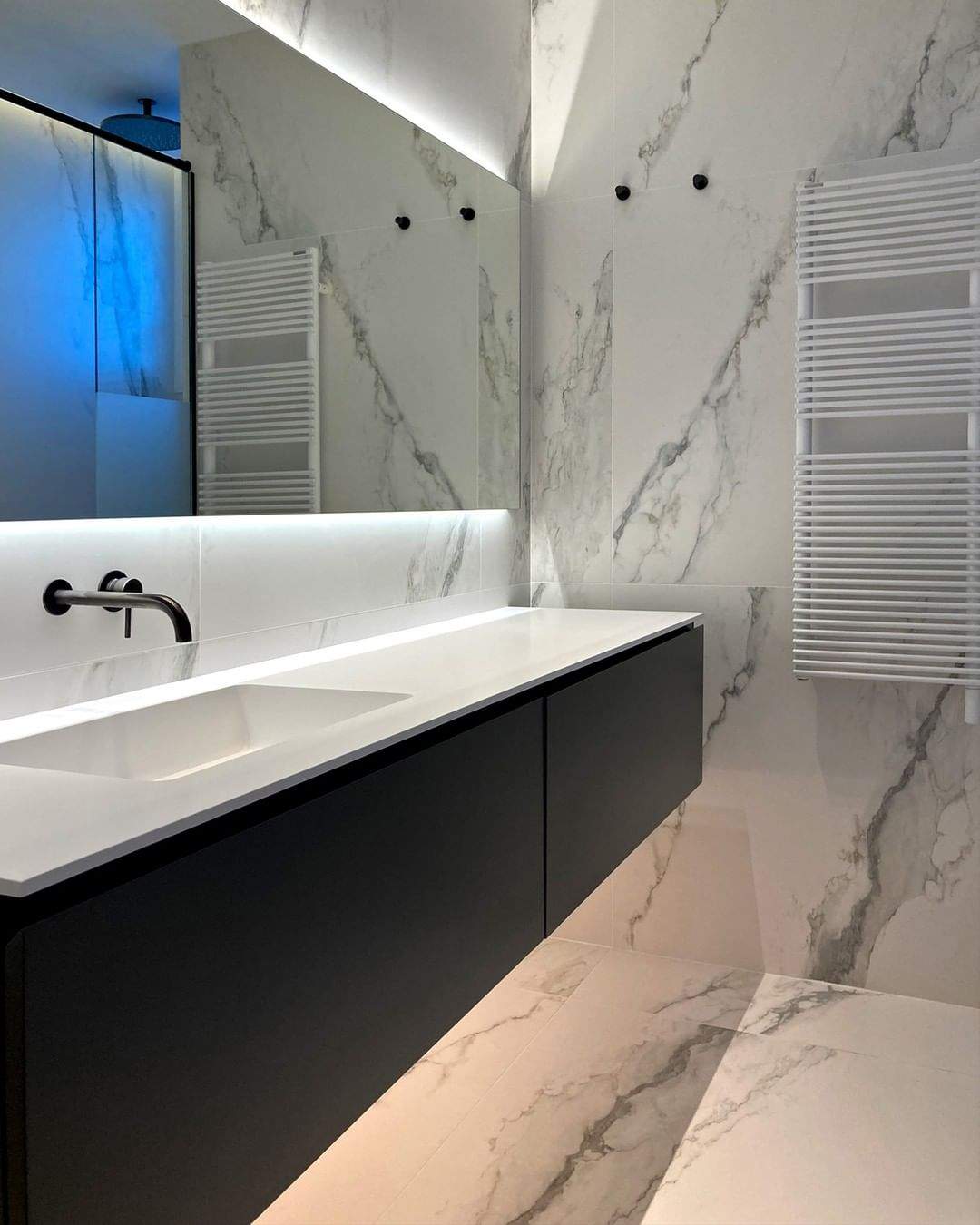 Líneas rectas y pulcras componen el diseño de este baño contemporáneo donde el porcelánico efecto mármol Calacatta blanco se encarga de dar el toque selecto.