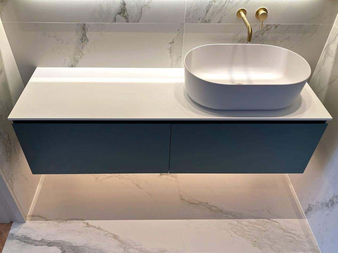 Los lavabos y muebles principales son elementos que se llevan todas las miradas cuando realizamos un proyecto de interiorismo para baños. En este caso se ha priorizado el uso de líneas rectas en mobiliario y formas curvas en lavabo y grifería para generar contraste; mientras que el acabado mate y los tonos elegantes terminan de crear un conjunto sofisticado y contemporáneo.