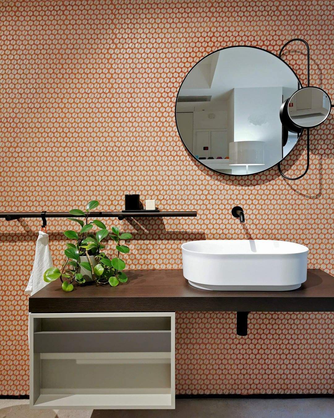 El diseño contemporáneo de este baño se puede apreciar en las líneas sugerentes del lavabo, la grifería y el espejo con doble aumento, muy bien complementados por la encimera de madera en tonos oscuros y un revestimiento cerámico en tonos naranjas muy original y atractivo.