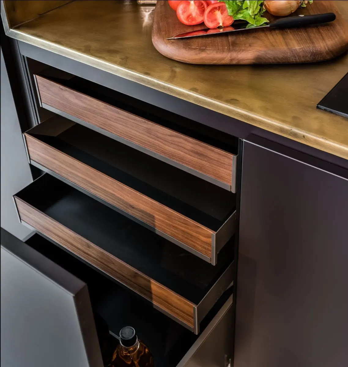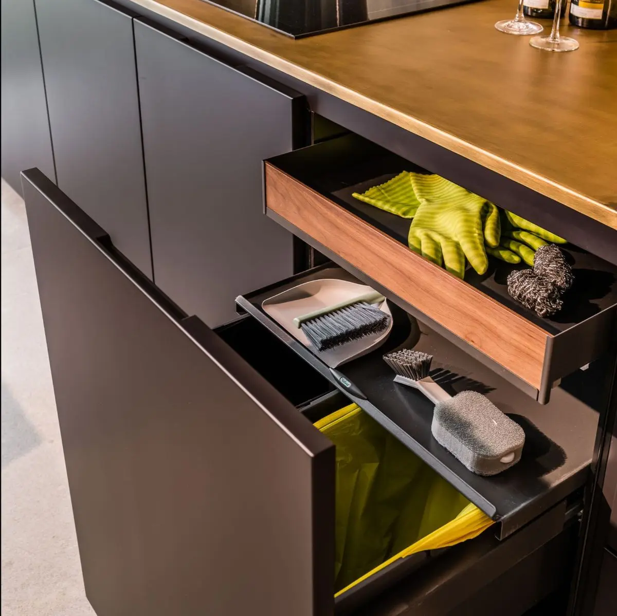 El más importante se encuentra en la parte inferior de la encimera de trabajo, y en él colocaremos armarios y cajones, muy útiles para tener todos los utensilios a mano, sobre todo los que usamos en el día a día. La zona superior del espacio de trabajo o un lateral son también muy buenas opciones para guardar accesorios y otros útiles de cocina menos comunes, ya que seguirán estando a nuestro alcance en caso de necesitarlos y, al utilizar el mismo diseño, nos ayuda a crear una composición en sintonía con el resto de la cocina.