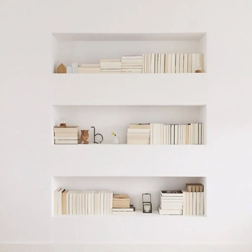Espacios de Almacenamiento: Las hornacinas ofrecen soluciones de almacenamiento discretas y elegantes. Pueden utilizarse en baños para guardar productos de belleza, en cocinas para especias o incluso en dormitorios para joyas.