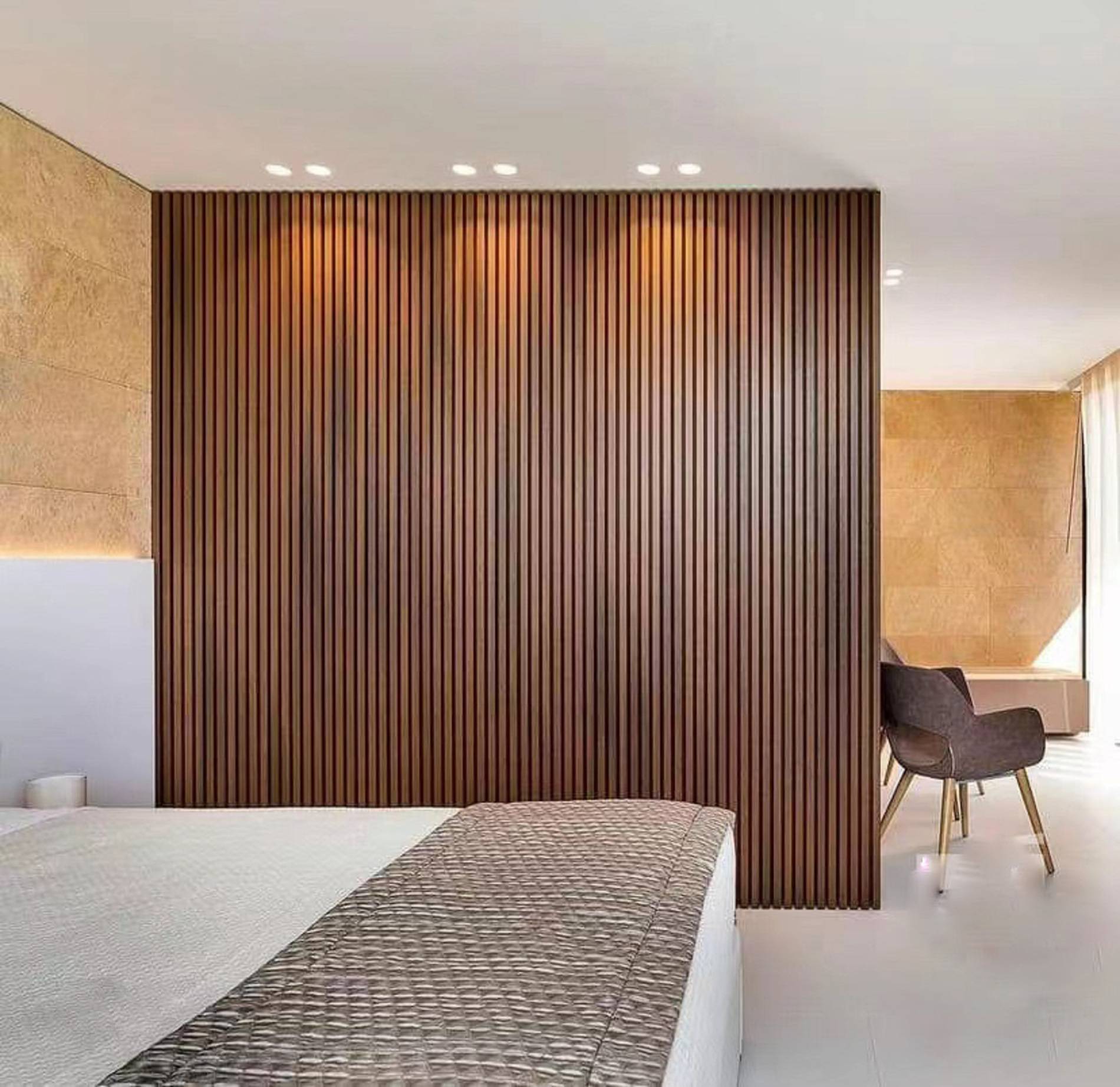Un cabecero de cama revestido con madera alistonada puede ser el punto focal de un dormitorio. Además de su valor estético, protege la pared de los roces y proporciona un aspecto acogedor y elegante.