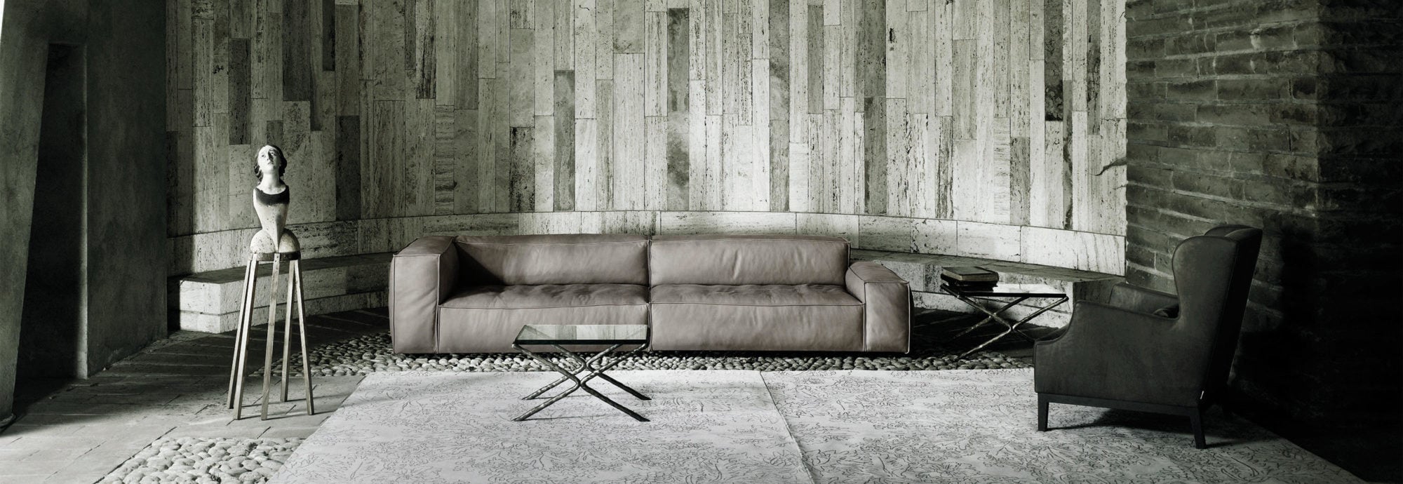 Tal espacio gira entorno al sistema tapizado, con formas y volúmenes discretos, en cuyo ámbito se proponen complementos de carácter bien marcado ―sillas, butacas y mesas de centro― que se adaptan a cada espacio y lo caracterizan, desde los más esenciales y rigurosos, hasta los más eclécticos y decorativos.