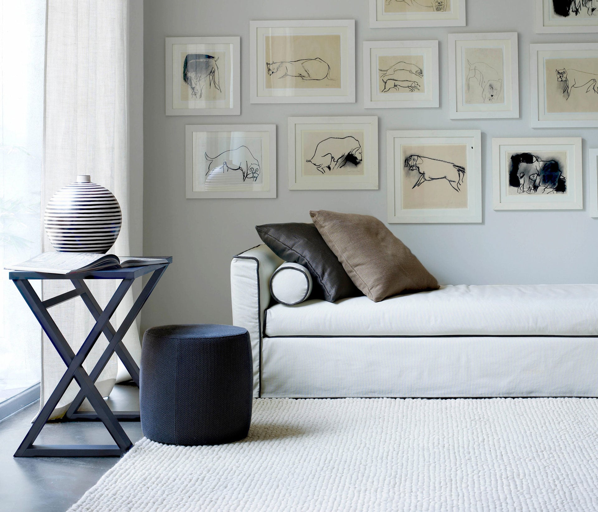 - Sleep: Una amplia colección de camas: cabeceros mínimos o maxi con acabados lisos o acolchados, bases con diferentes alturas y soportes de colchón que permiten una completa adaptabilidad a la anatomía del cuerpo. Mesillas de noche, cómodas, escritorios y complementos sugieren un dormitorio íntimo y sofisticado caracterizado por su propia identidad.