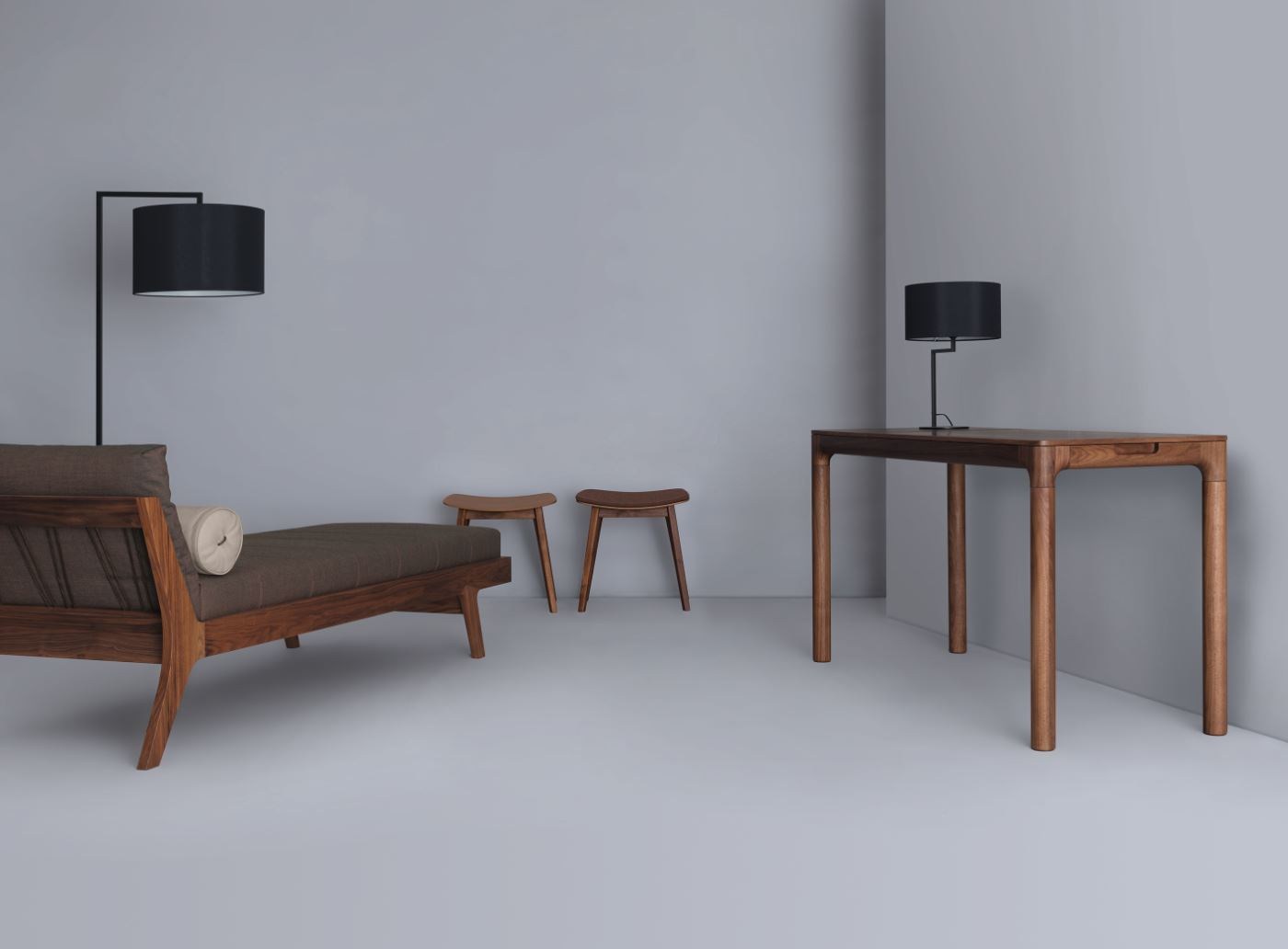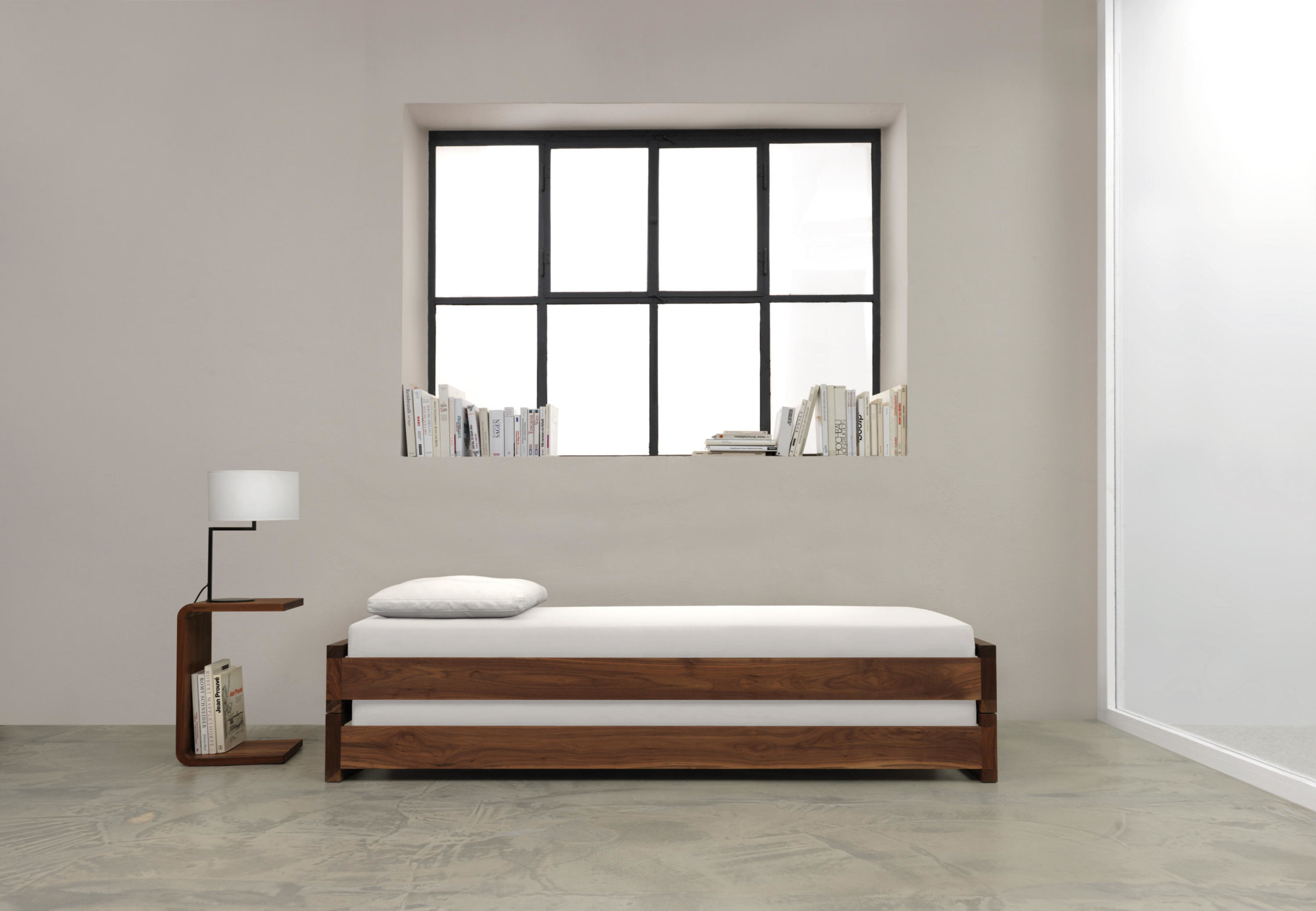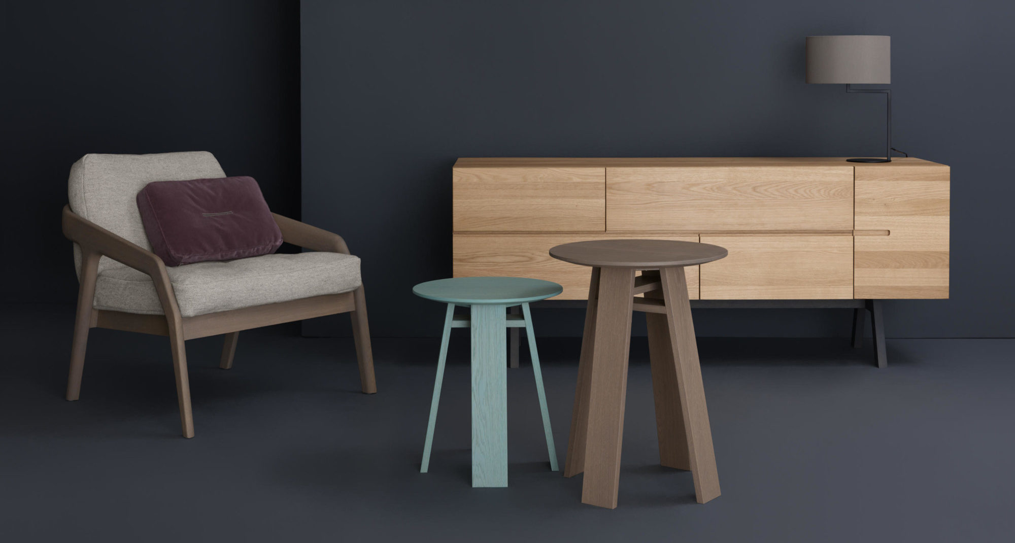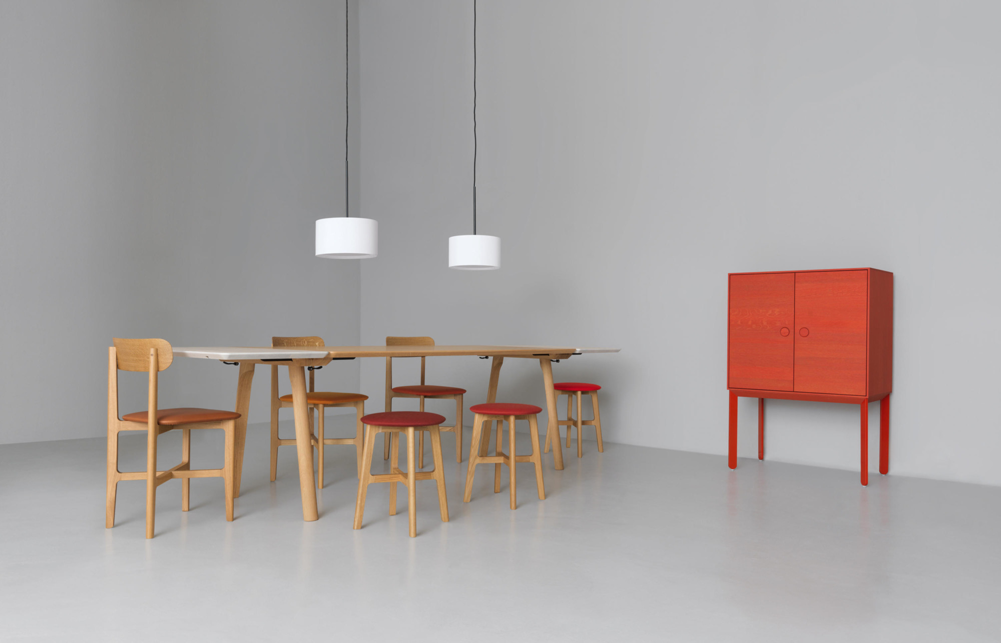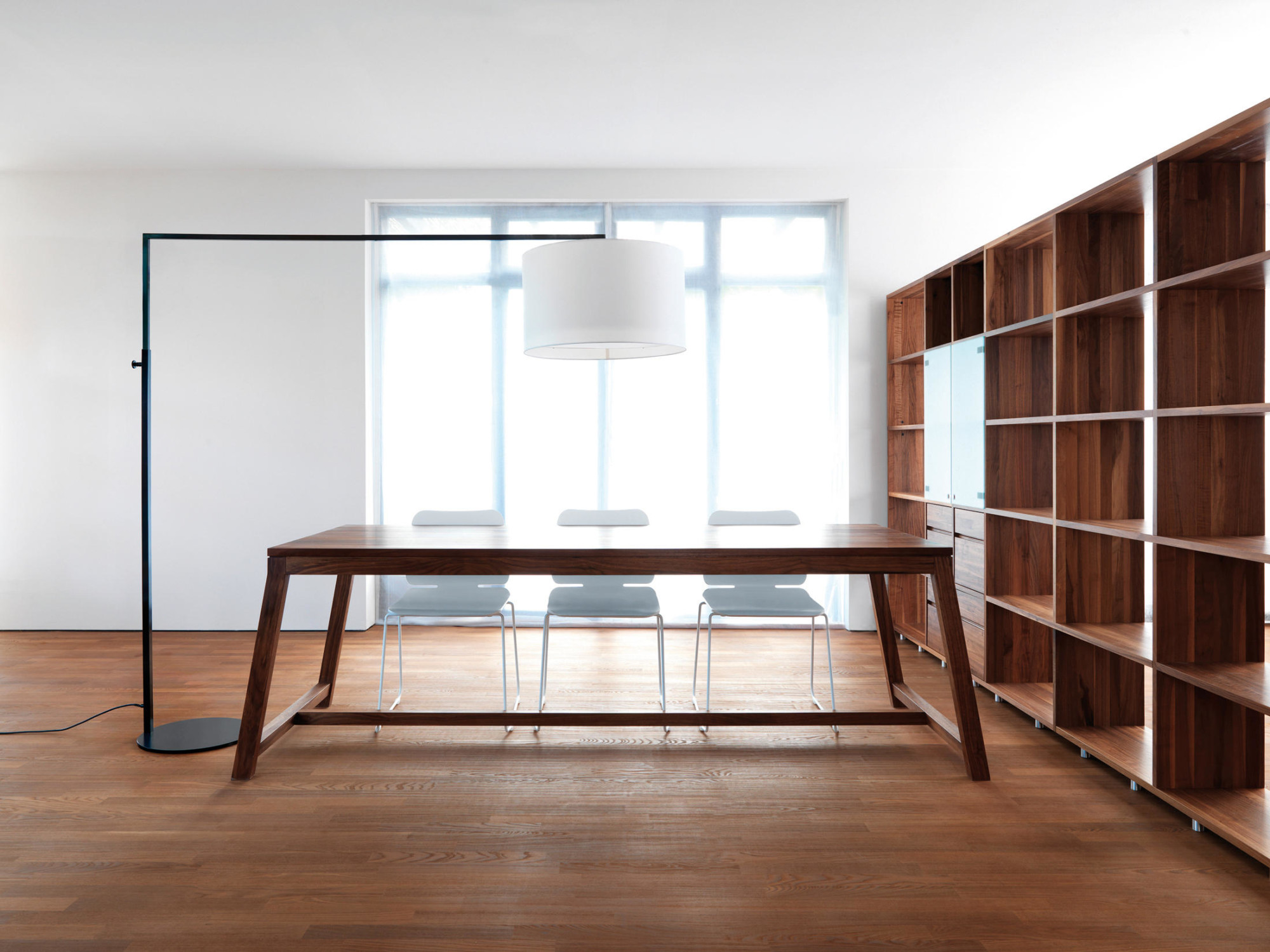 Cada pieza de mobiliario Zeitraum es única. La madera para cada pieza se selecciona y se combina individualmente, lo que la hace única en términos de color y grano. Esta firma solo utiliza maderas duras: actualmente haya, roble, arce, cerezo y nogal.