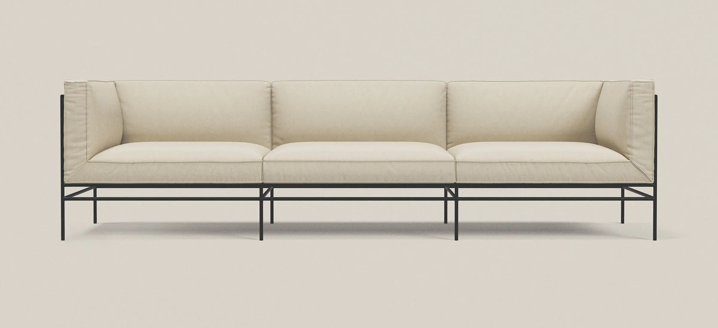 El sofá exclusivo de diseño «Middleweight», realizado por Michael Anastassiades para Karakter surge de la unión de lo mejor de dos mundos: el super italiano sofá lounge por un lado y el sofá box danés compacto por el otro. Colocados en un marco de acero delgado y abierto, los cojines se mantienen unidos firmemente por cremalleras y cuidadosamente ingleteado en las esquinas del marco, asemejándose a los bordes afilados del papel doblado.