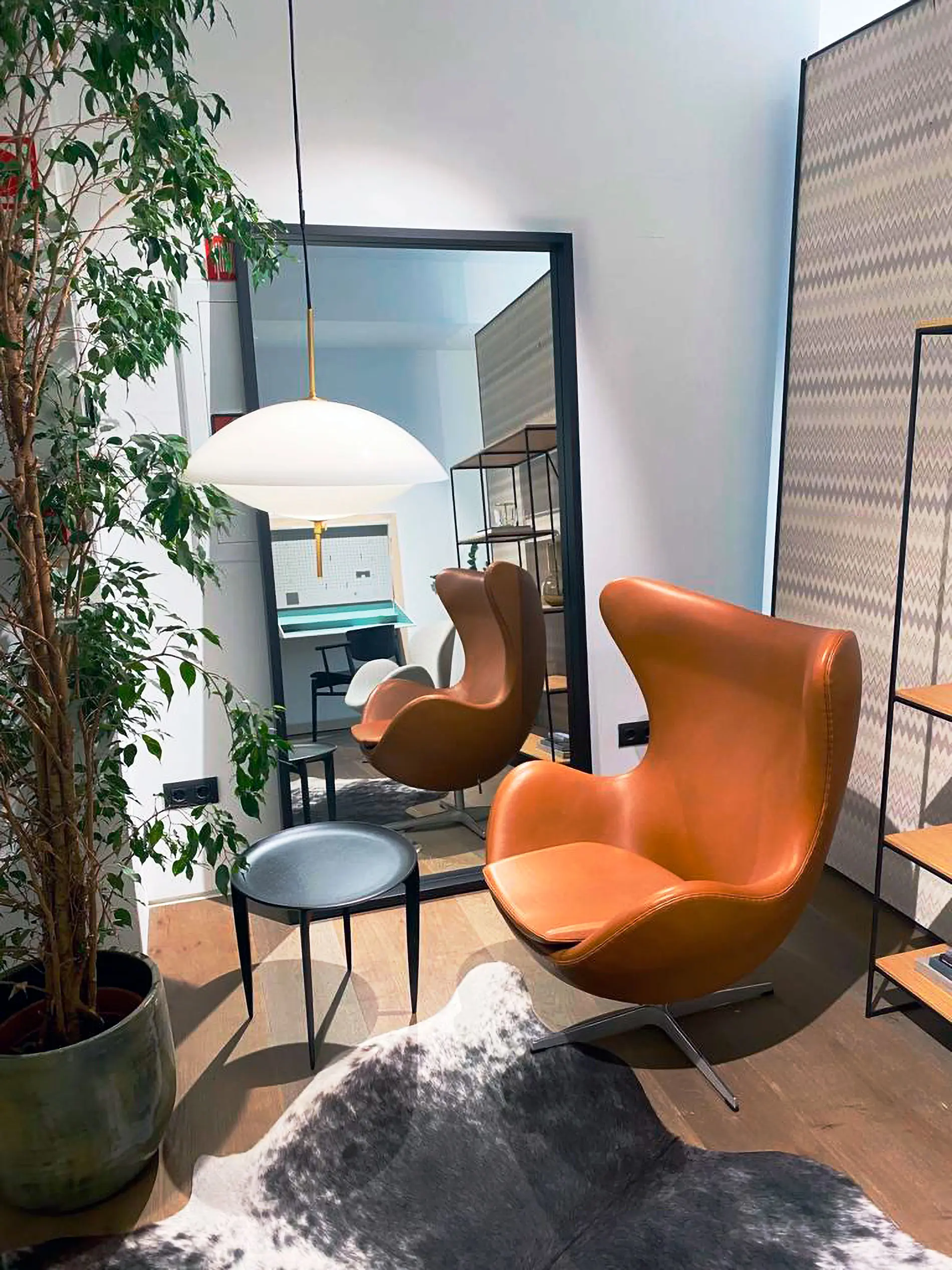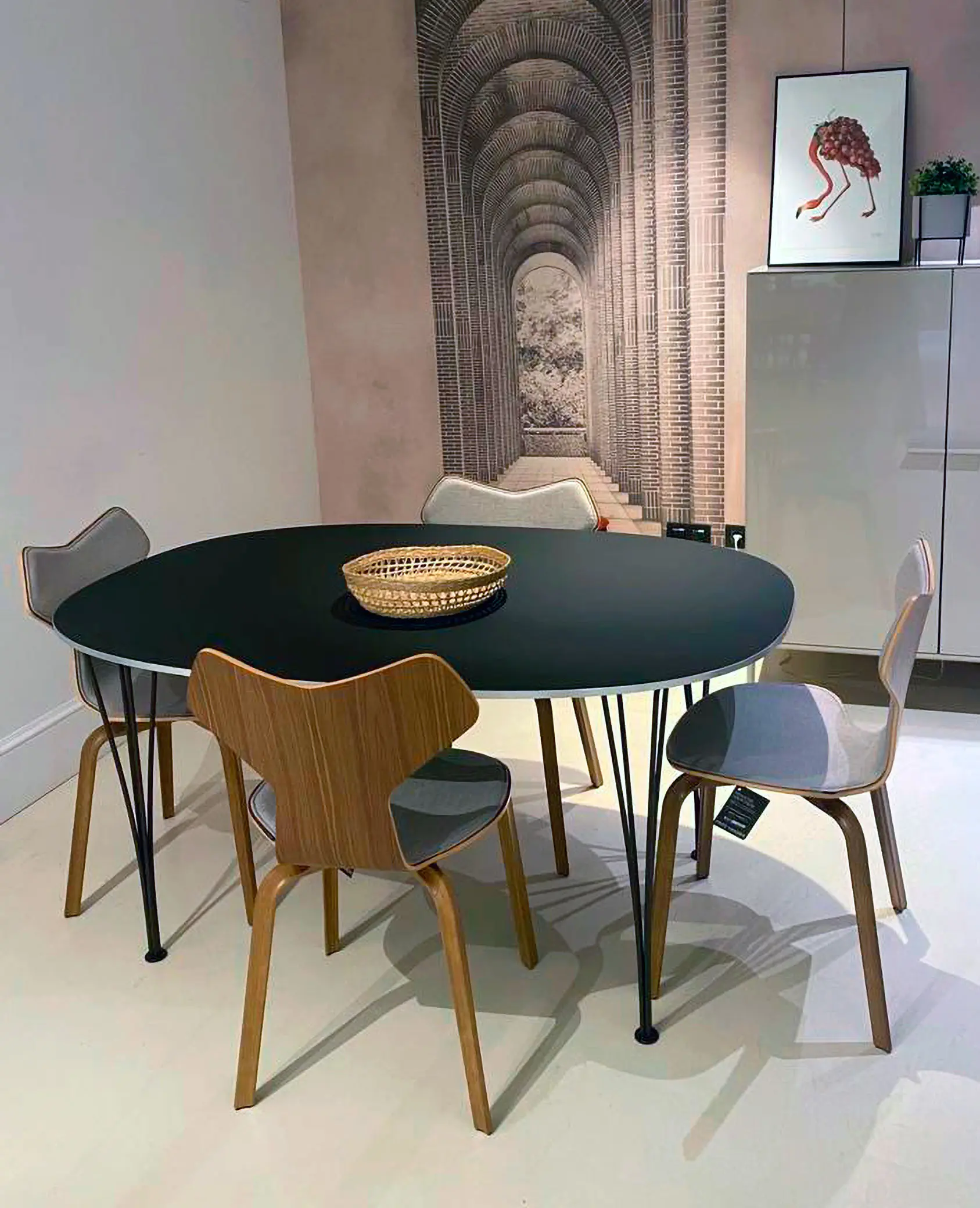 Para comenzar, queremos resaltar esta zona de comedor con la mesa Super Elliptical diseñada por Piet Hein, Bruno Mathsoon y Arne Jacobosen, inspirado en la solución de tráfico de que puso Piet Hein en una rotonda super elíptica en Estocolmo. El modelo de mesa se realiza tanto circular como rectangular. Junto con la mesa, las sillas Grand Prix de Arne Jacobsen, su nombre fue asignado tras ganar el precio Grand Prix de la Triennale de Milán en 1957. Para hacer de este rincón un espacio especial, agregamos el aparador Side Up de la marca Alivar, lacado con tapas y tiradores de aluminio brillante, tras su apertura nos encontramos espejo, estantes y 3 cajones en roble termo-tratado o nogal con tapa de piedra acrílica lacada.