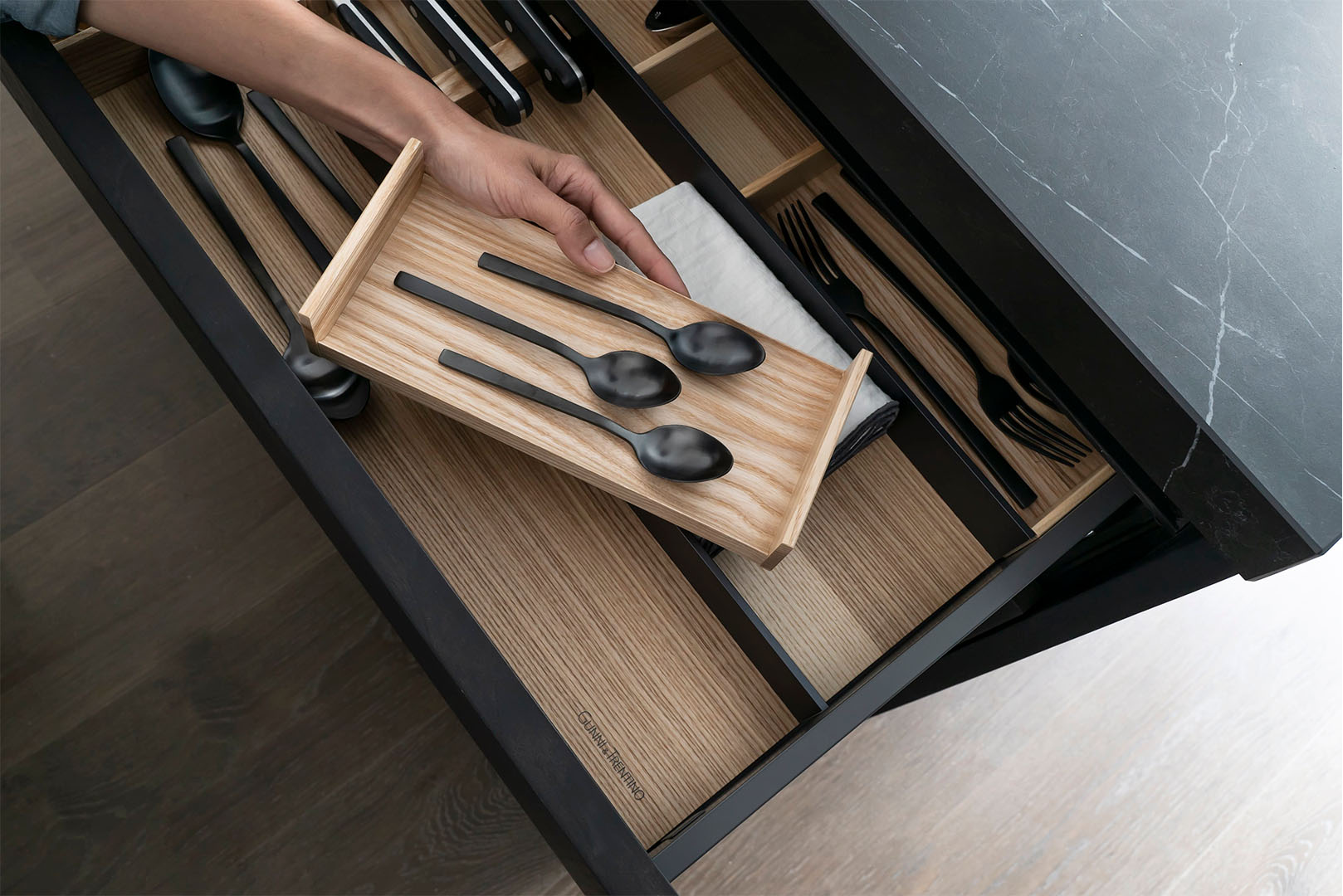 El área de cocina y los vestidores han sido pensados no solo como espacios funcionales, sino como extensiones del estilo de vida que propone el proyecto: orden, elegancia y equilibrio. Este proyecto residencial ha sido promovido por Alzaria, con diseño arquitectónico a cargo de B4STUDIO y comercializado por Colliers. Gunni & Trentino ha intervenido en la selección e instalación de materiales y equipamientos, reafirmando su compromiso con el diseño de excelencia.