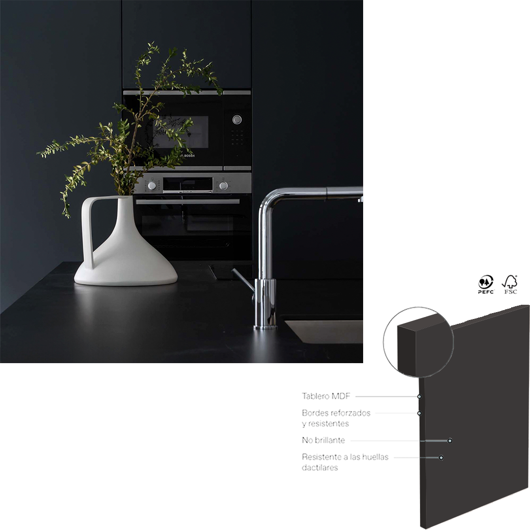 Puertas elaboradas en tablero MDF de alta densidad, lacadas con varias capas de imprimación y fondo de poliéster. El acabado final se realiza con poliuretano 2K en efecto supermate, logrando:
