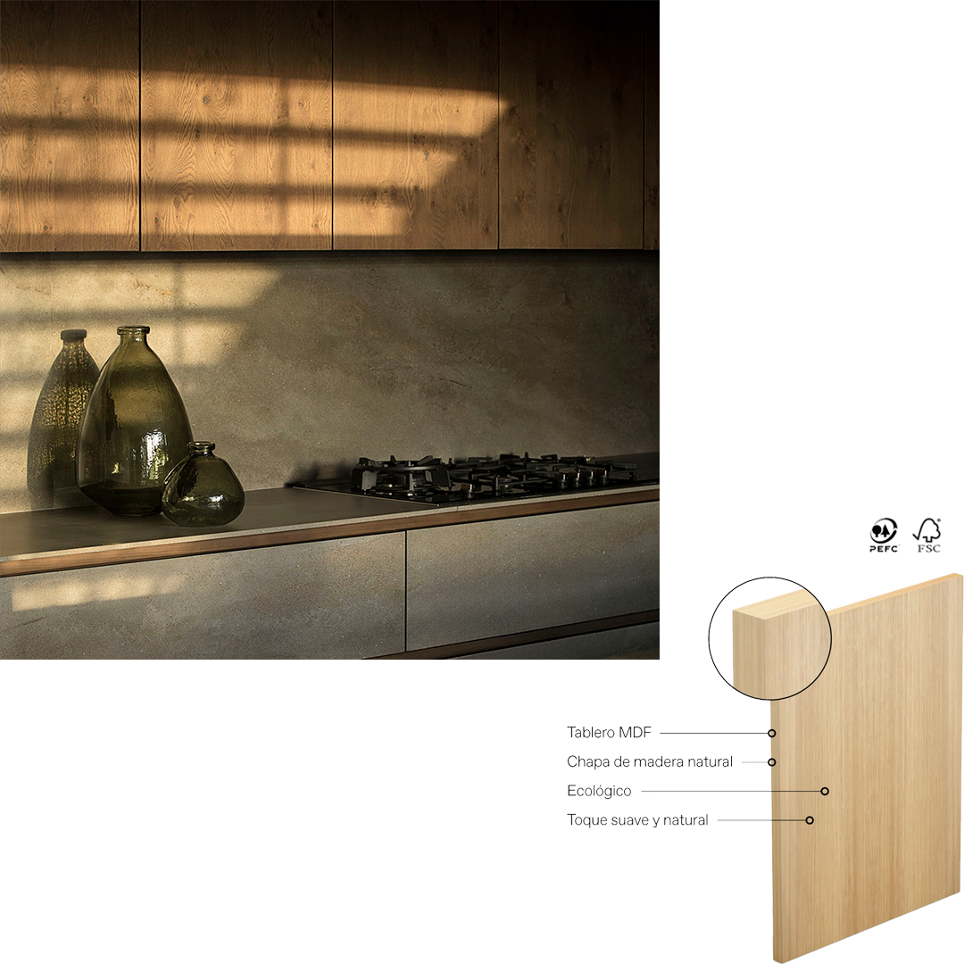 Puertas elaboradas en tablero MDF de alta densidad, lacadas con varias capas de imprimación y fondo de poliéster. El acabado final se realiza con poliuretano 2K en efecto supermate, logrando: