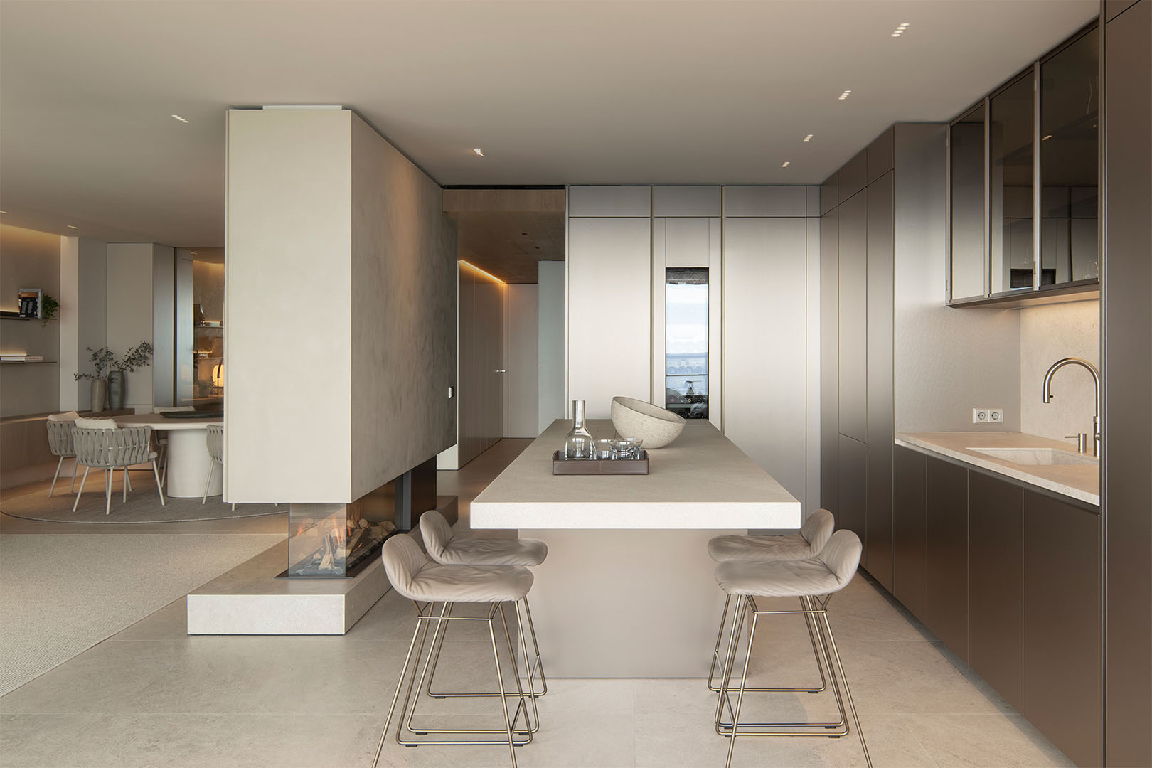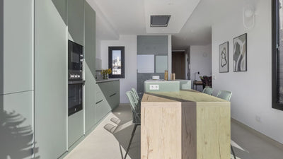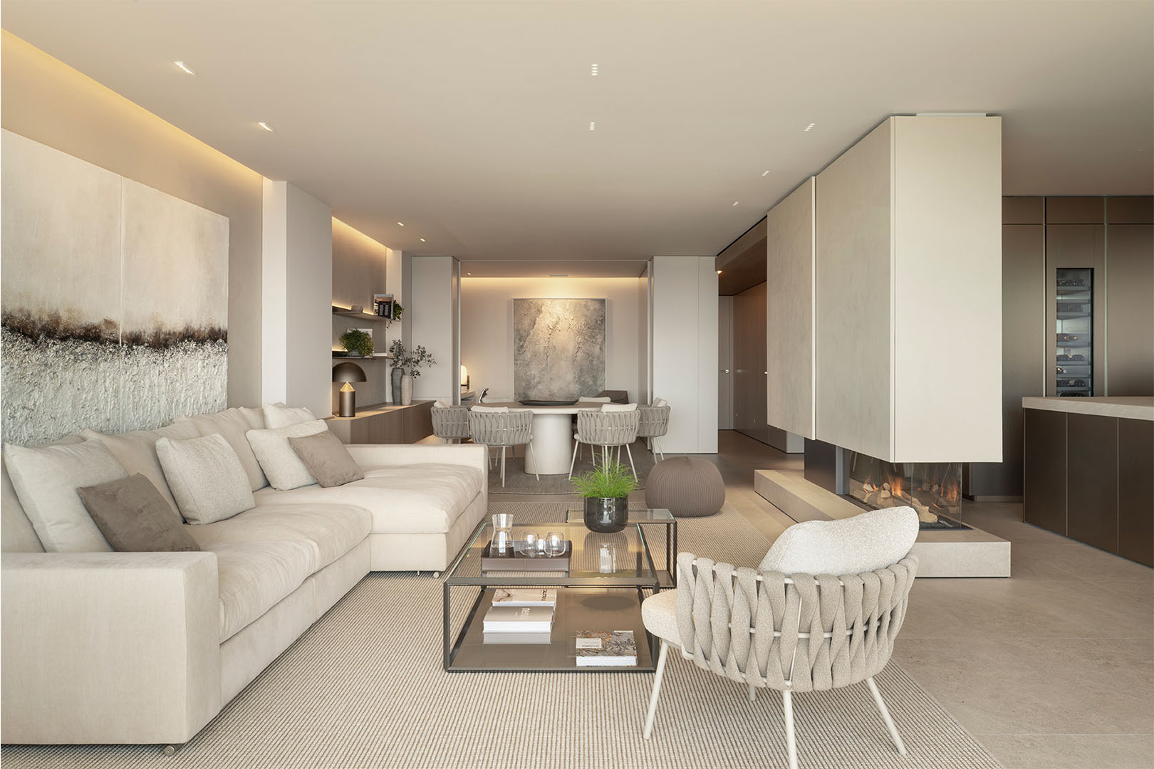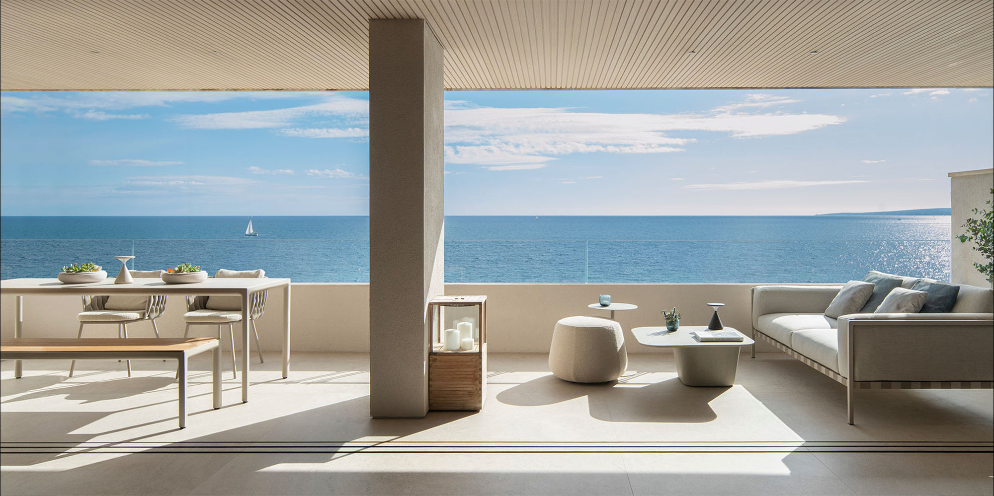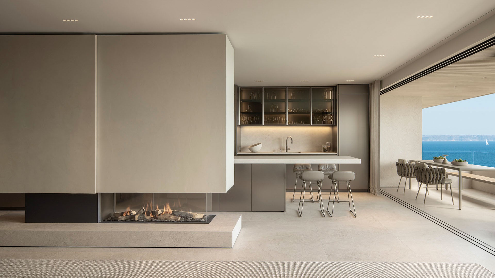El interior se estructura en torno a espacios abiertos y bañados por luz natural, donde cocina, comedor y salón comparten una atmósfera serena, fluida y funcional. La sobriedad formal, unida a la selección de mobiliario de Terraza Balear, define un estilo contemporáneo sin artificios, pensado para el disfrute cotidiano en equilibrio con el entorno.