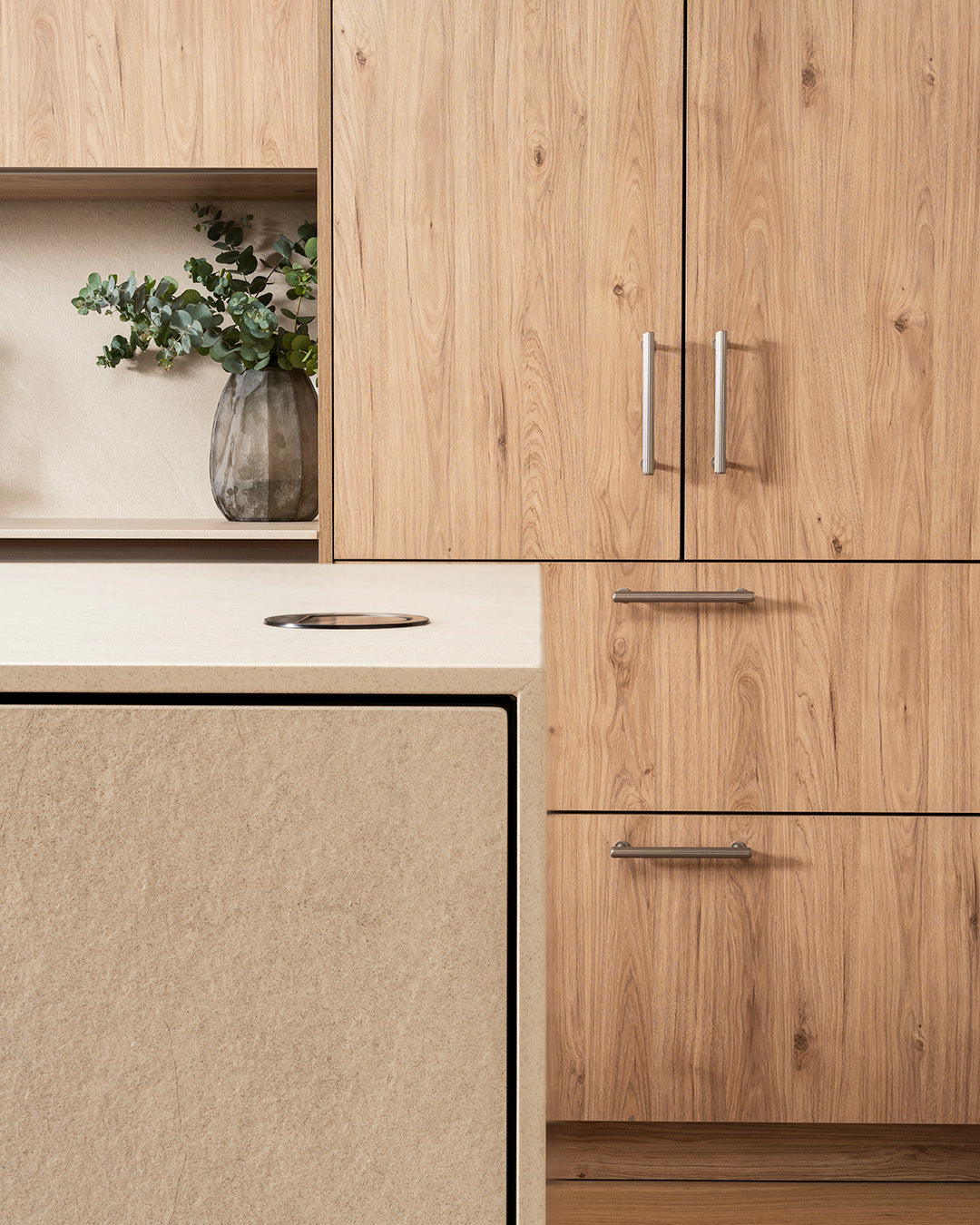 Para ello, se diseñó una cocina a medida con líneas limpias y acabados en madera clara, aportando calidez y funcionalidad desde un enfoque minimalista. El espacio se ordena visualmente a través de texturas suaves y materiales nobles, generando una estética atemporal y orgánica.