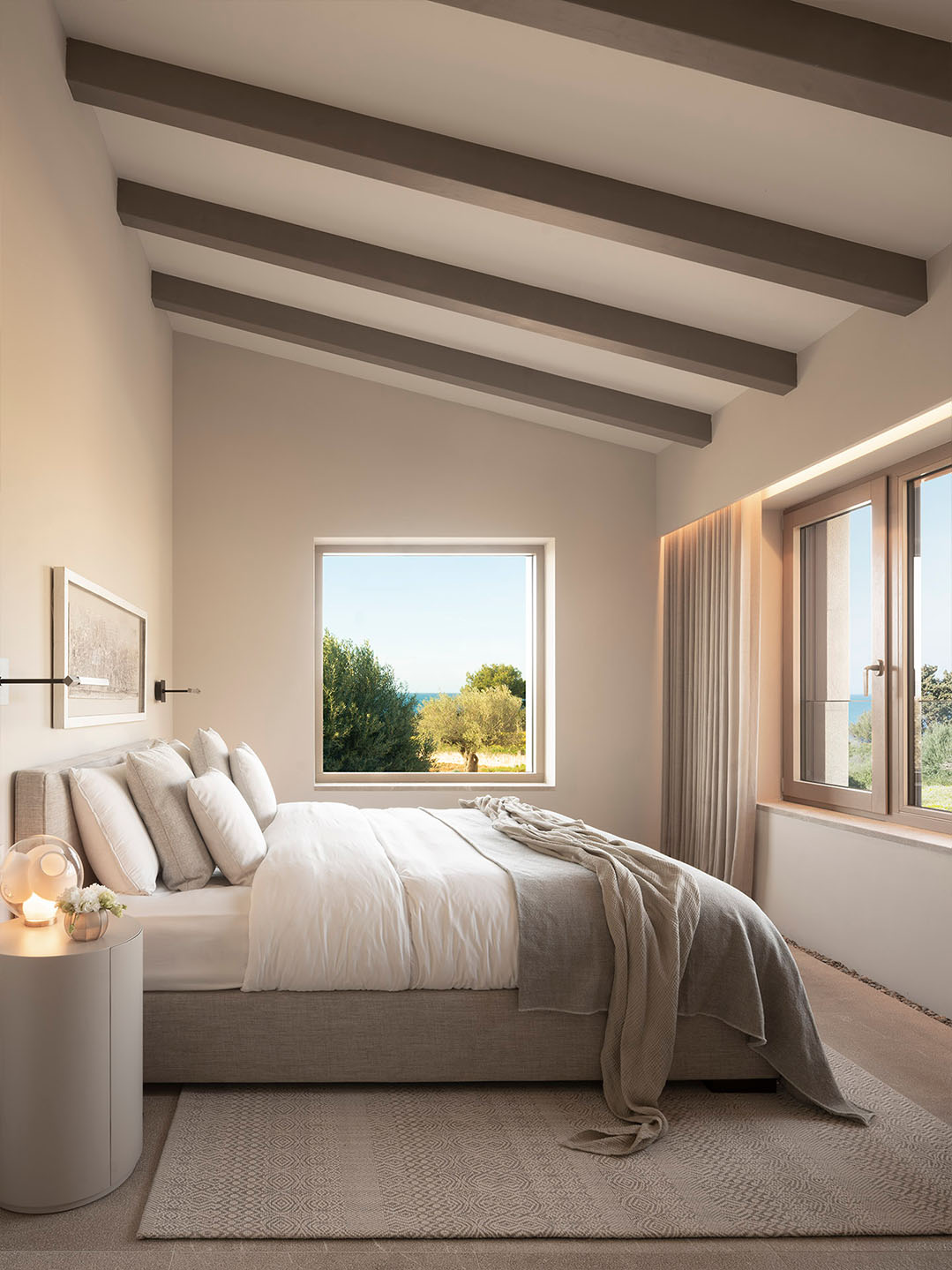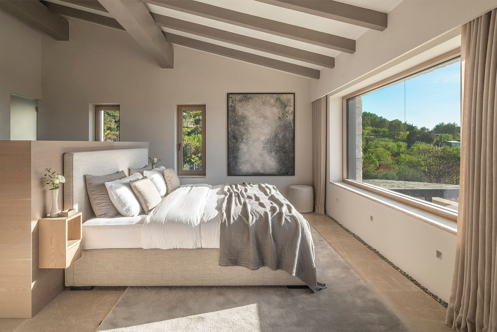 El interior se proyecta como una prolongación del exterior, manteniendo la calidez, la naturalidad y la pureza del conjunto. Se han elegido materiales orgánicos como la madera, el algodón y el lino, que visten el espacio con sobriedad y confort. El salón y los dormitorios, sin estridencias ni ornamentos superfluos, transmiten calma y autenticidad, invitando a vivir con sencillez, pero sin renunciar al diseño.
