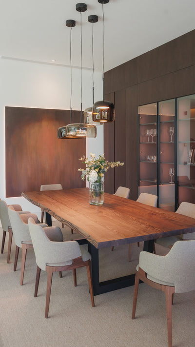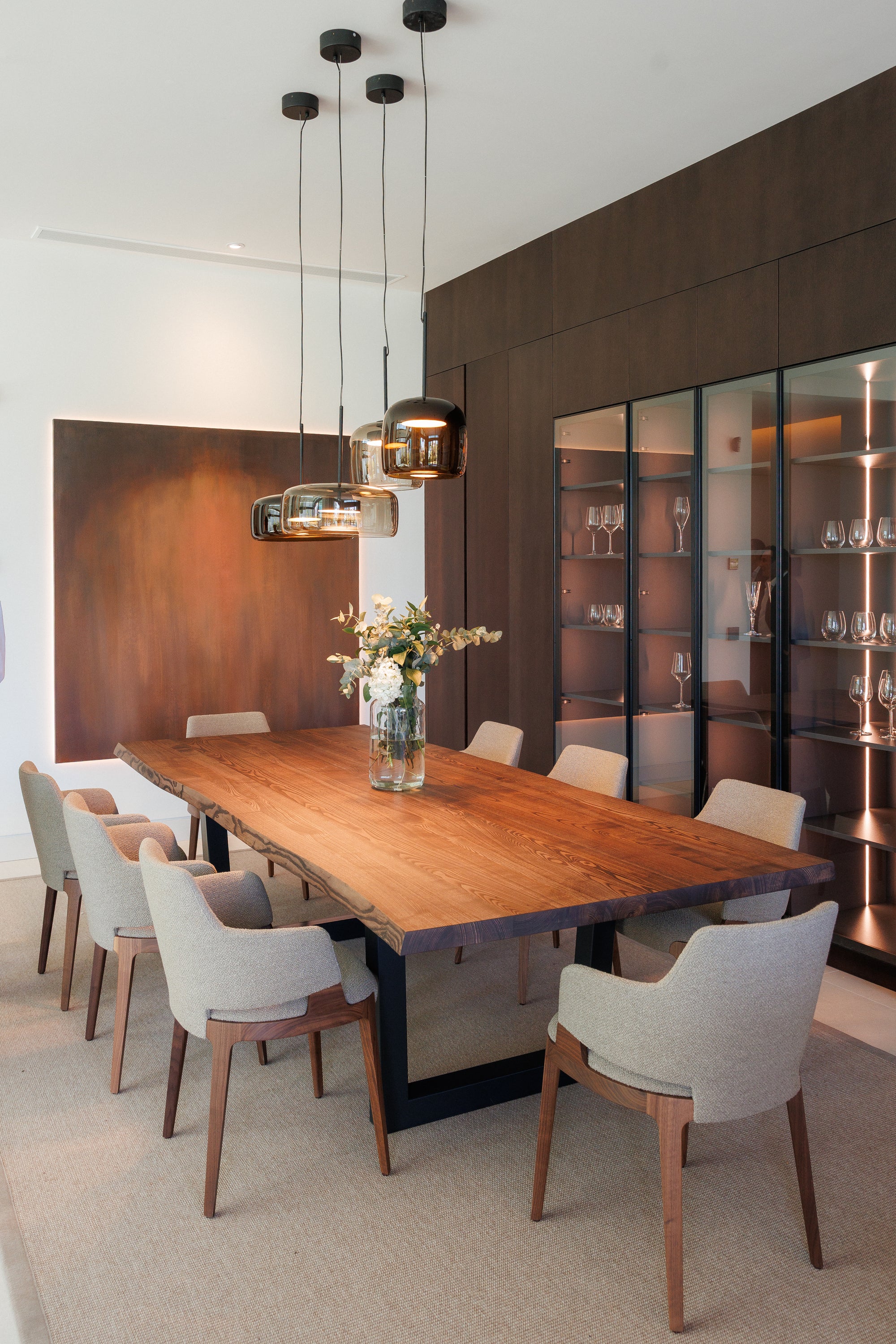 La selección de materiales vertebra todo el proyecto: porcelánicos de gran formato, piedras naturales de vetas suaves, maderas nobles y metales en tonos bronce y níquel cepillado. Esta paleta, neutra y luminosa, refuerza la continuidad interior–exterior, haciendo que cocina, comedor, baños y terrazas se perciban como una misma secuencia de luz, textura y proporción.