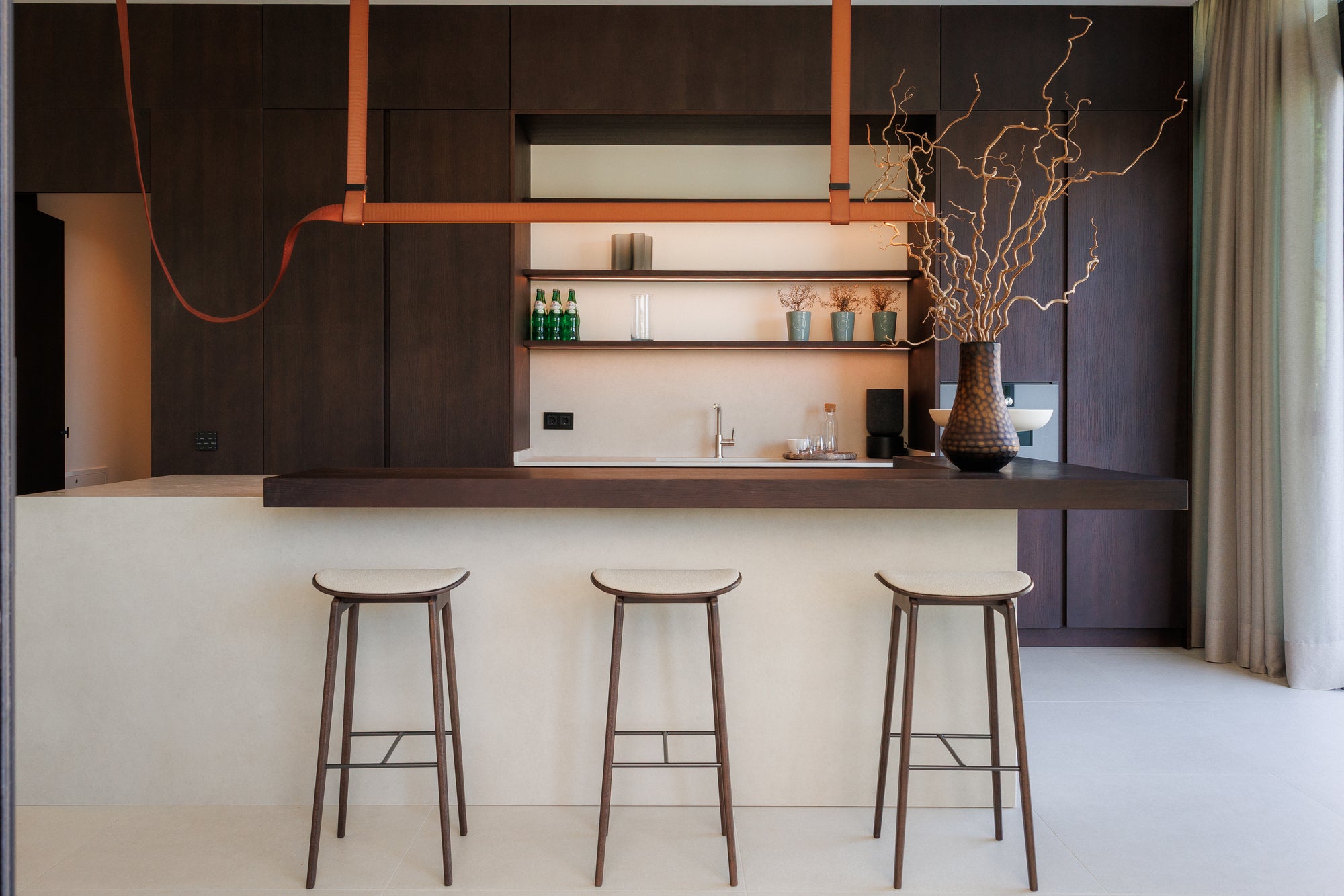 La cocina de Gunni & Trentino se plantea como un núcleo social de la vivienda, conectada con el comedor y abierta al exterior para favorecer un modo de habitar fluido, mediterráneo y luminoso. Una gran barra longitudinal articula la transición entre cocinar, reunirse y disfrutar de las vistas al jardín, convirtiéndose en pieza central tanto por su uso diario como por su presencia escultórica.