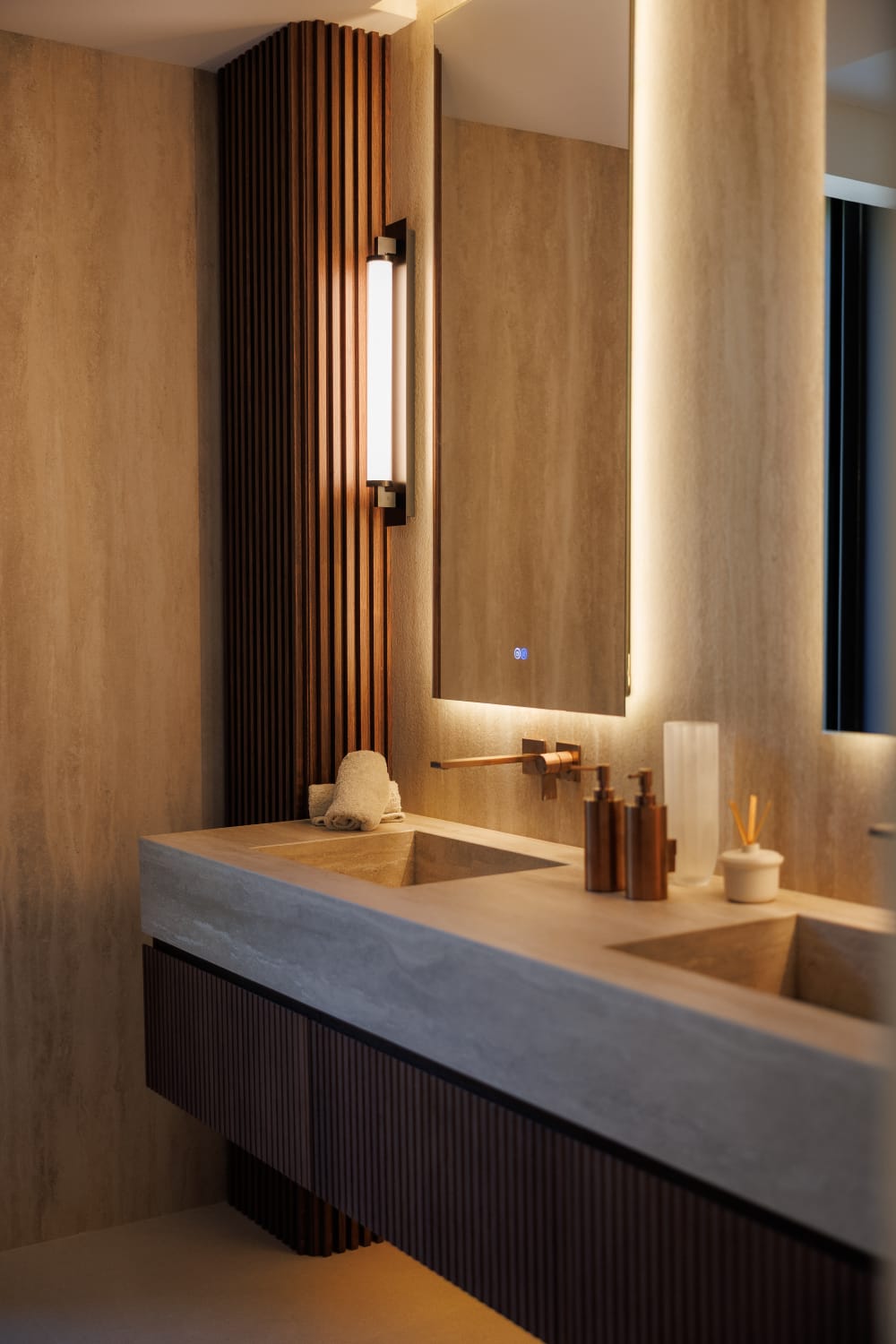 En los baños de Gunni & Trentino, trasladamos la misma búsqueda de calma y coherencia táctil. Se combinan aplacados pétreos de tonos crema y arenas con mobiliario a medida en madera natural, generando una atmósfera envolvente y silenciosa.