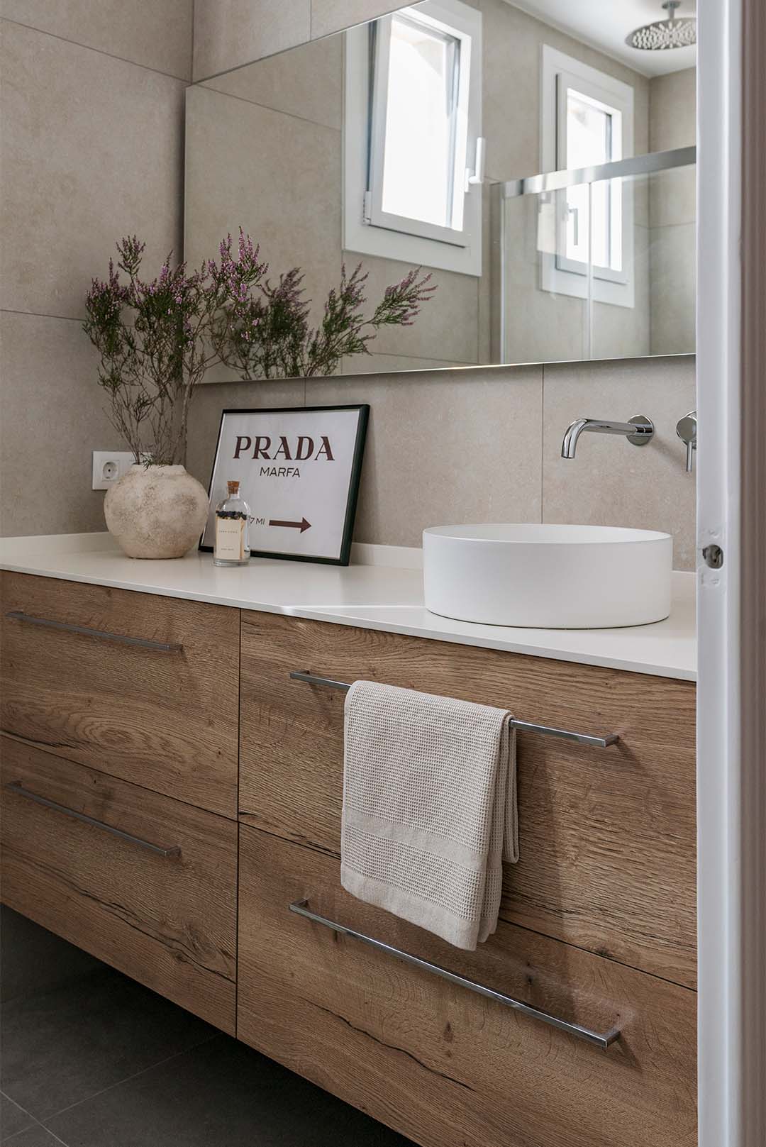 El baño se convierte en uno de los espacios protagonistas del proyecto, diseñado como un refugio de calma y funcionalidad. La selección de materiales, azulejos, grifería y acabados, no solo responde a criterios estéticos, sino que también aporta soluciones prácticas para el uso cotidiano, generando un entorno armónico y atemporal.