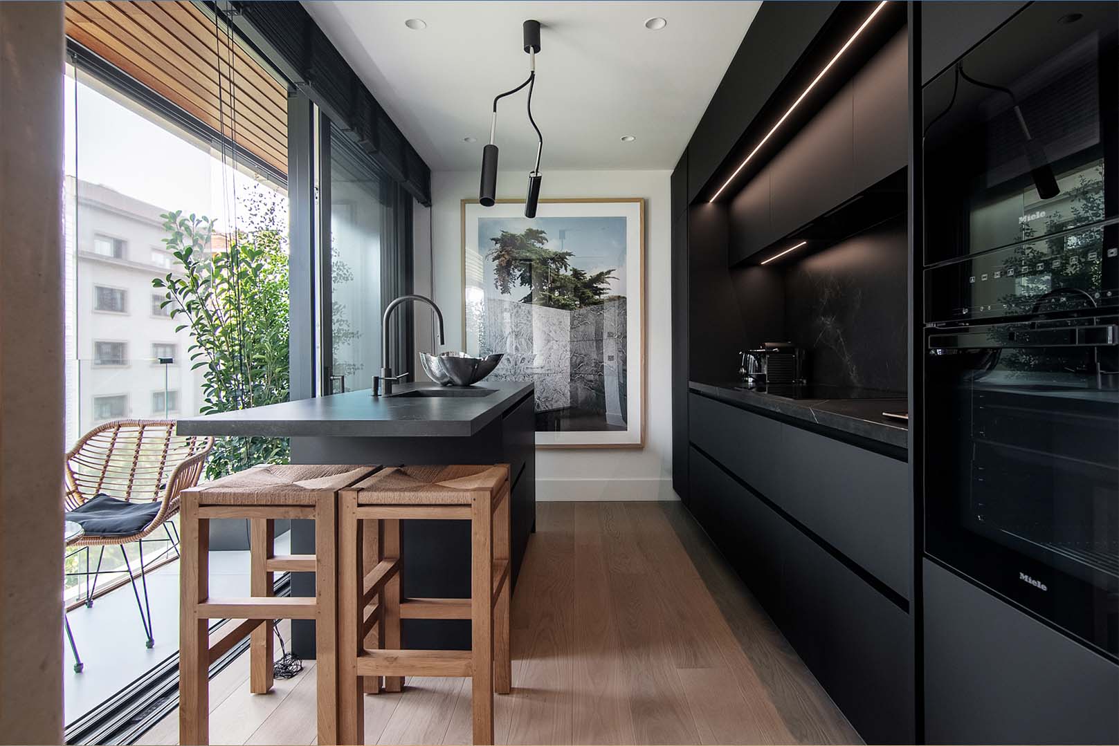 La sofisticación del negro veteado se equilibra con la calidez del roble, aportando profundidad sin perder luminosidad. La cocina, concebida como centro vital del hogar, combina soluciones técnicas avanzadas con un diseño depurado y elegante.