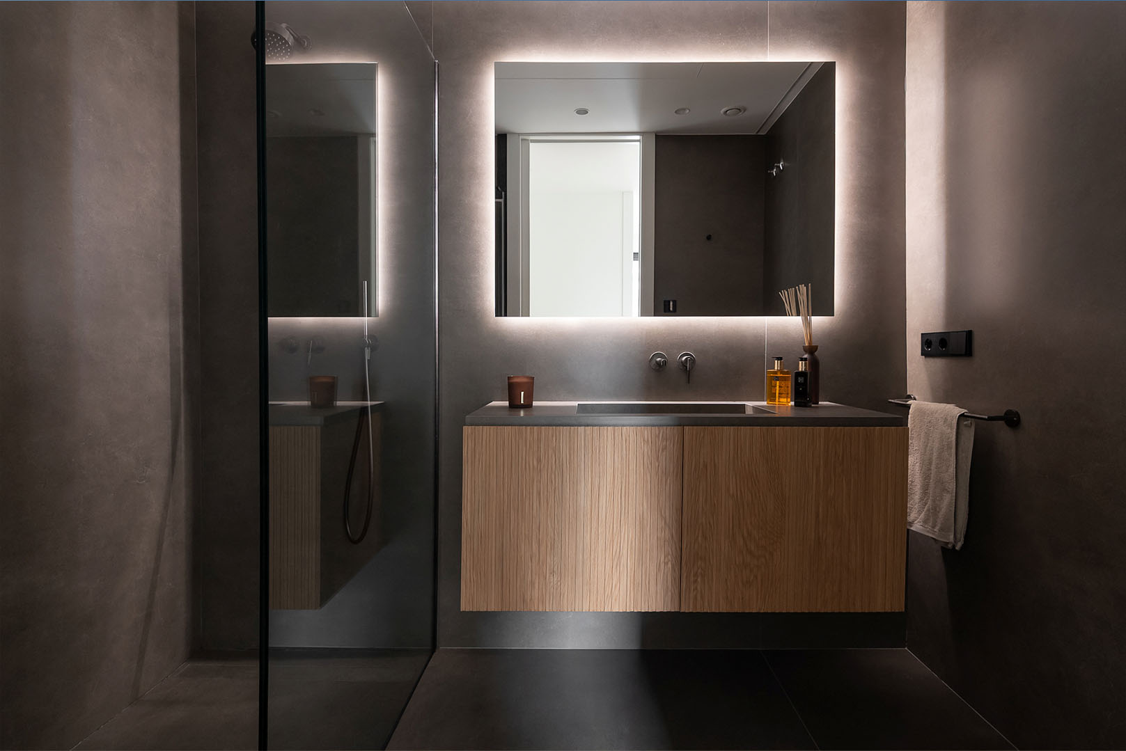 El acabado Lora Negro y el roble natural articulan un lenguaje visual elegante y coherente. La piedra porcelánica negra con vetas blancas se extiende en encimeras y superficies, conectando cocina y baño con una continuidad serena. La cocina firmada por Gunni & Trentino y los muebles de baño de TRENTINO subrayan el carácter exclusivo del conjunto.