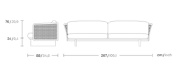 El sofá de 3 plazas de exterior, parte de la colección Mesh diseñada por Patricia Urquiola, combina materiales naturales e industriales, logrando un equilibrio armonioso entre superficies duras y blandas, y volúmenes transparentes y sólidos. Su diseño contemporáneo y sofisticado resalta el contraste, creando una familia de muebles ideal para exteriores. Con una base de madera natural de teca y una estructura de aluminio, es apto tanto para interiores como para exteriores.