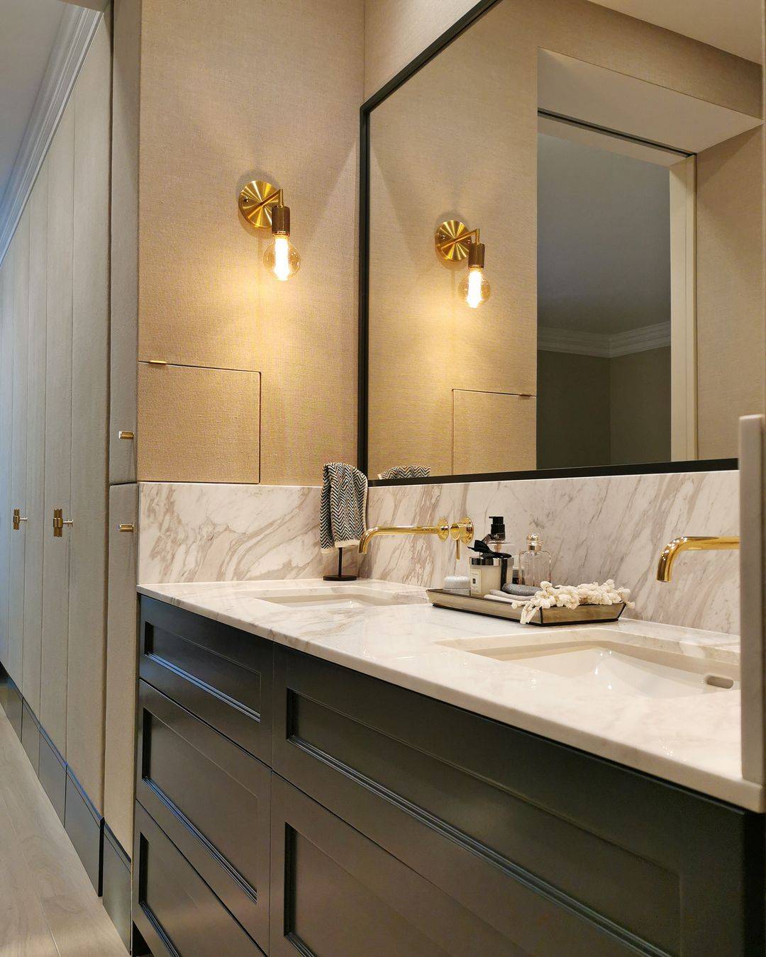 Con un marcado estilo clásico-renovado, en sintonía con el resto de la casa, este baño está plagado de pequeños detalles que nos hacen admirarlo: las bombillas retro que iluminan la consola principal, el papel usado como revestimiento que se integra con el del resto de la habitación, etc.