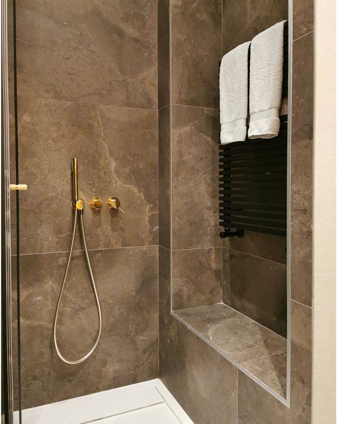 De la ducha destacamos la armonía que se crea entre sus diferentes elementos: una grifería muy elegante en tonos dorados, materiales atractivos que le dan el toque más clásico, y la puerta en cristal tintado color negro que termina de unir toda la composición.