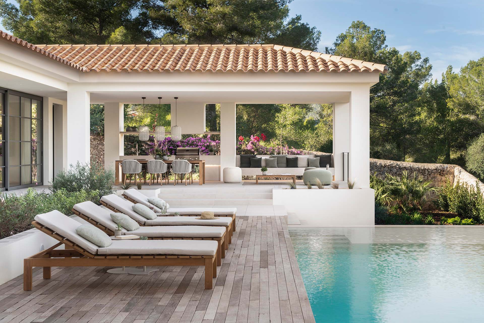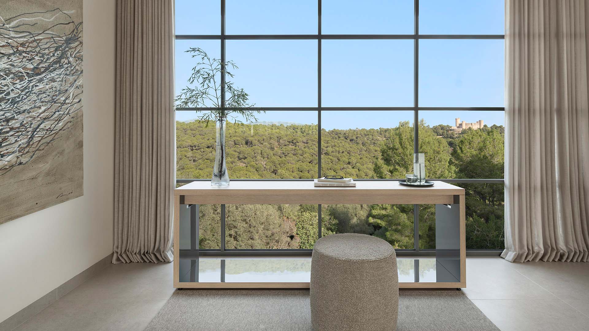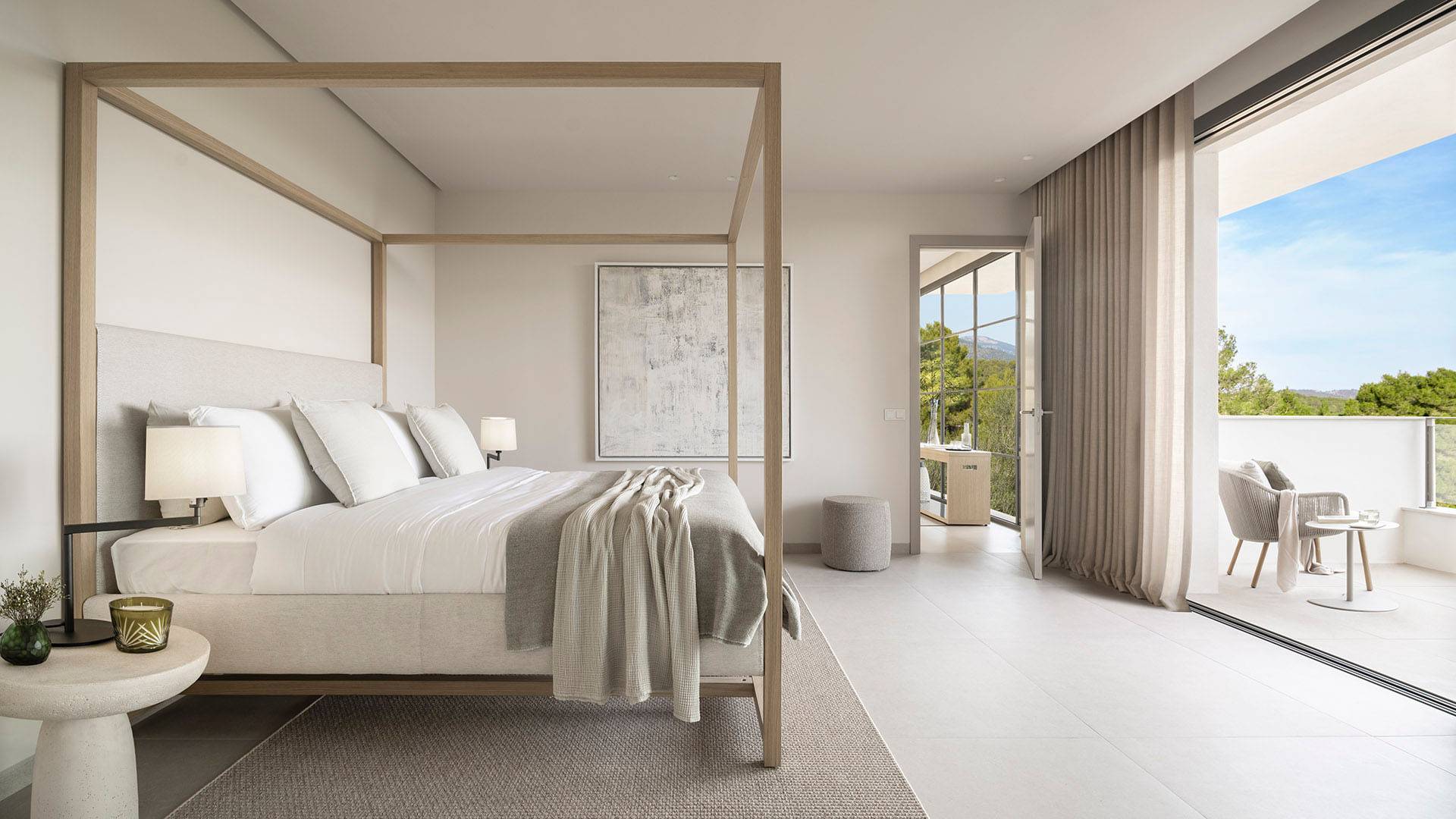 La zona de descanso, en la planta superior, ofrece un refugio tranquilo con una cama con dosel en el dormitorio principal, con vistas al Castillo de Bellver y a los atardeceres rosados. Los espacios exteriores invitan a disfrutar de la naturaleza circundante, con materiales que se integran con el paisaje boscoso y un porche equipado para veladas al aire libre. Bonanova es más que una casa, es un hogar donde la elegancia se une con la naturaleza para crear experiencias familiares inolvidables.
