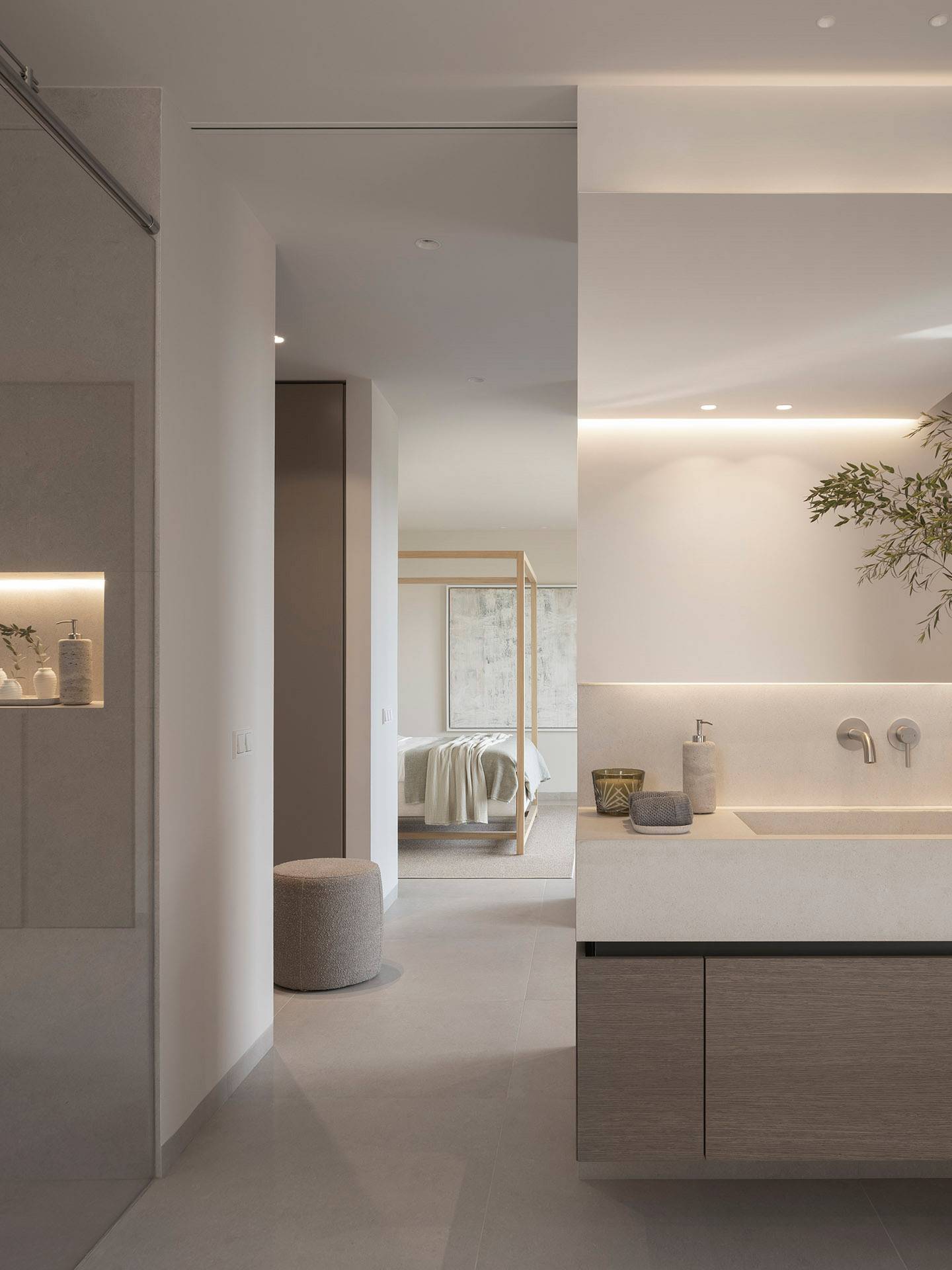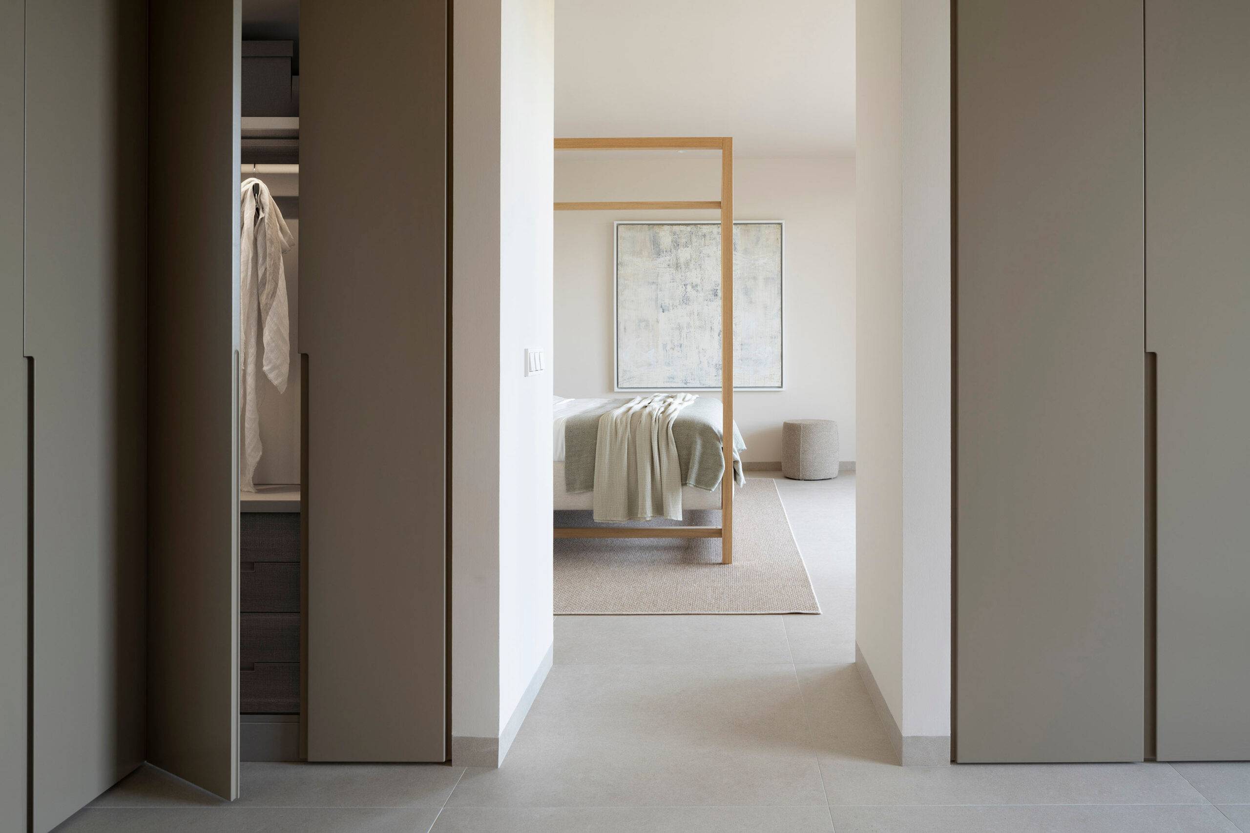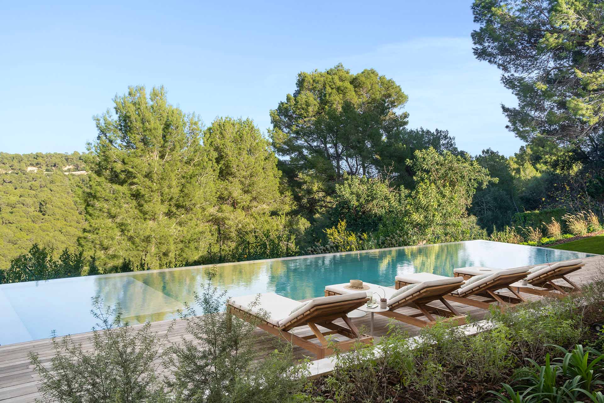 La zona de descanso, en la planta superior, ofrece un refugio tranquilo con una cama con dosel en el dormitorio principal, con vistas al Castillo de Bellver y a los atardeceres rosados. Los espacios exteriores invitan a disfrutar de la naturaleza circundante, con materiales que se integran con el paisaje boscoso y un porche equipado para veladas al aire libre. Bonanova es más que una casa, es un hogar donde la elegancia se une con la naturaleza para crear experiencias familiares inolvidables.