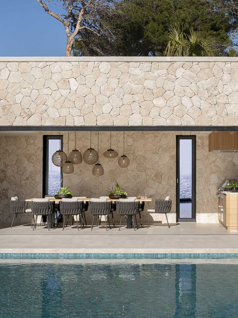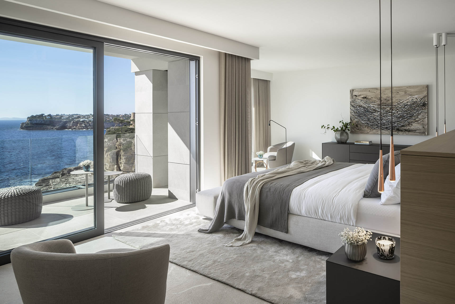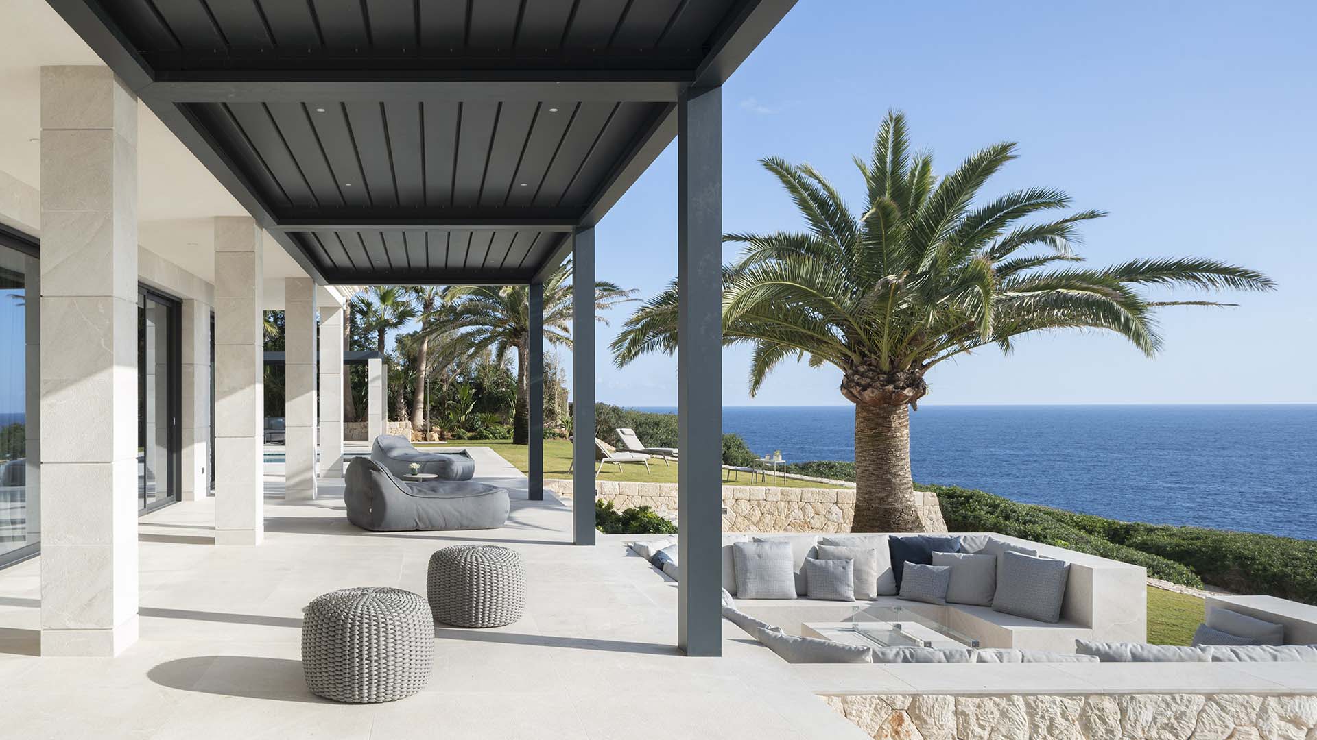 Villa D8, situada en la costa sureste de Mallorca, se encuentra entre acantilados rocosos, ofreciendo vistas impresionantes.