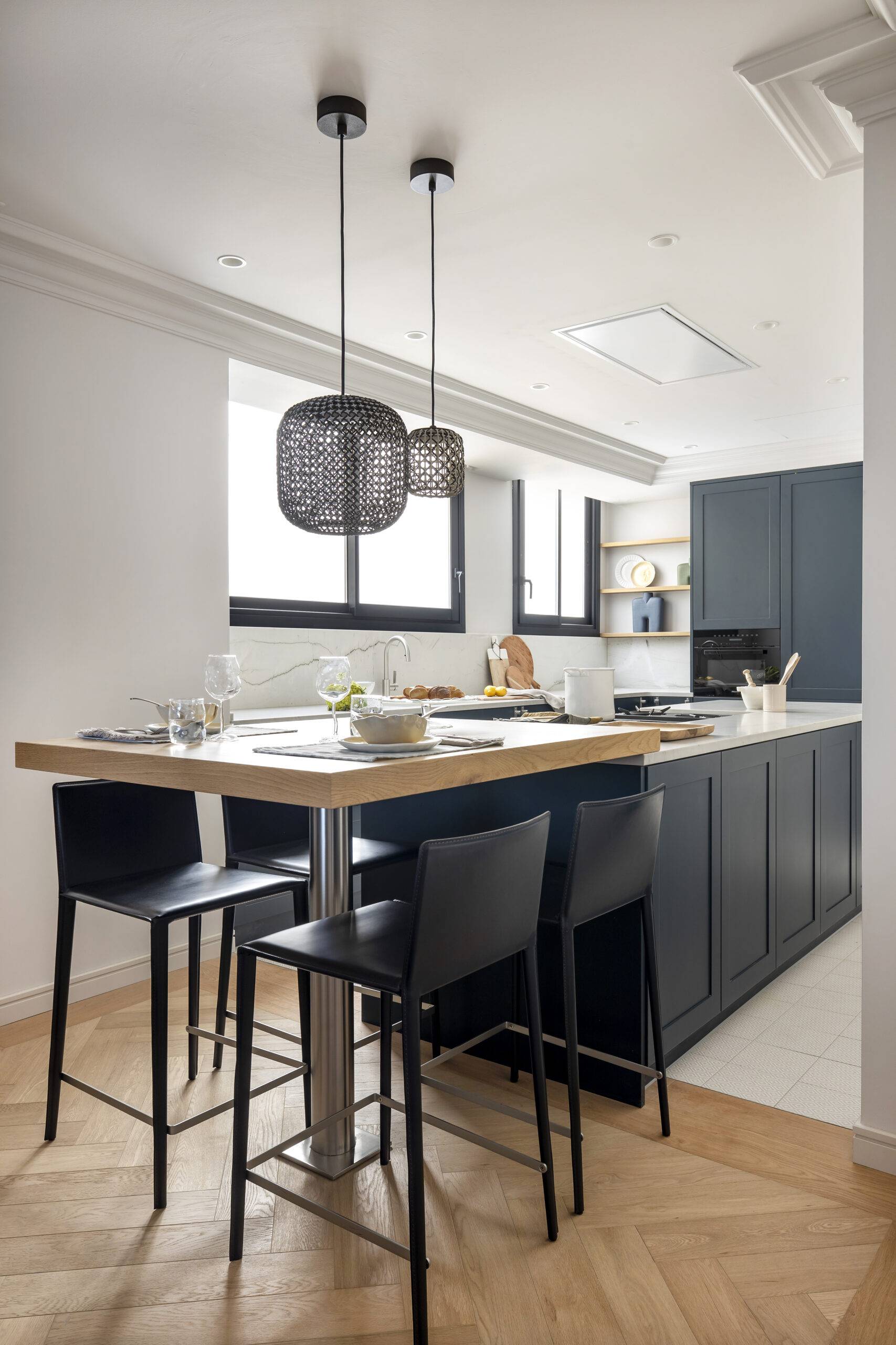 La combinación de madera en tonos suaves en la zona de la barra y los taburetes azules crea un contraste ideal, convirtiendo el espacio en un ambiente acogedor. La zona de cocción en acero emerge como una pieza clave en este diseño.