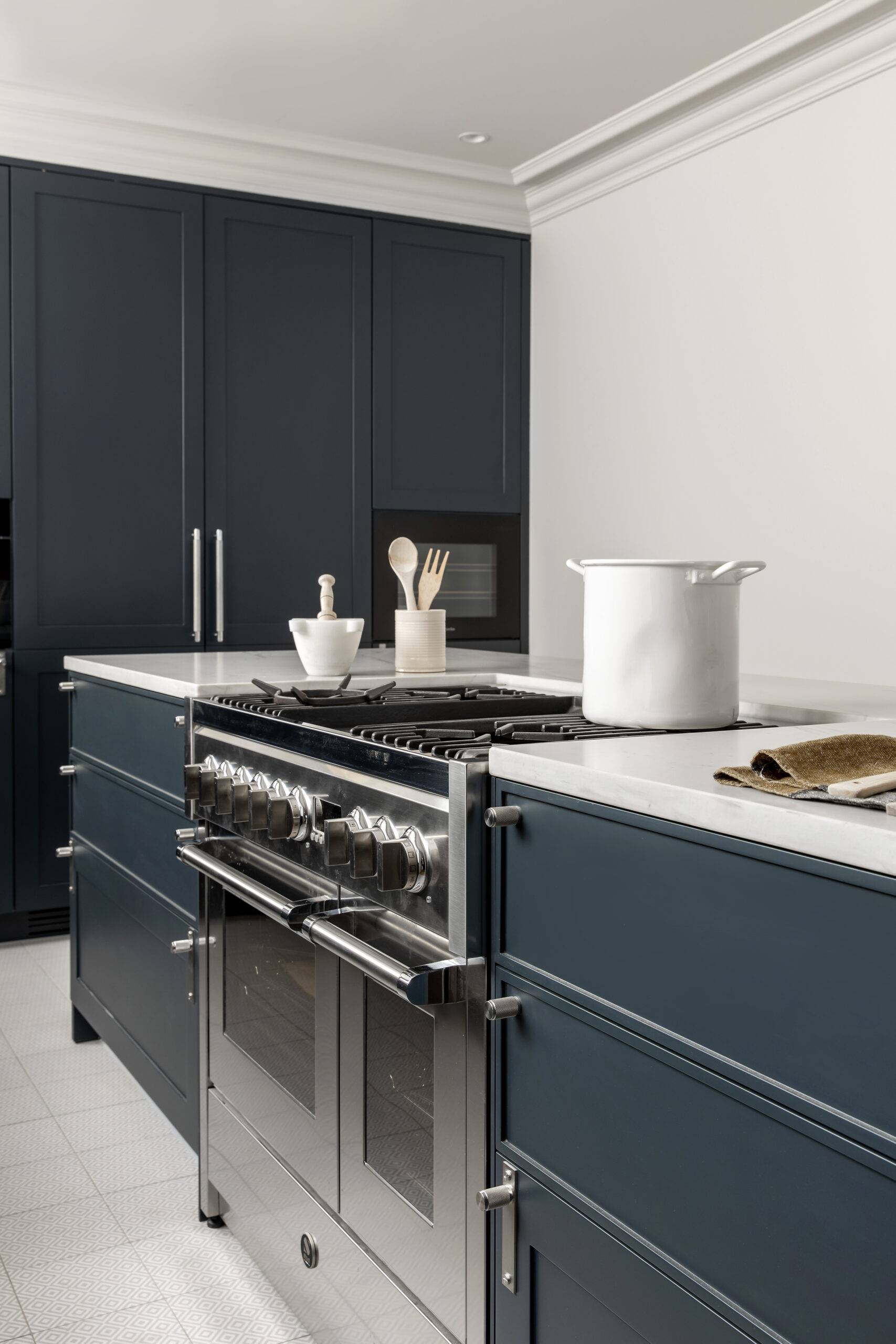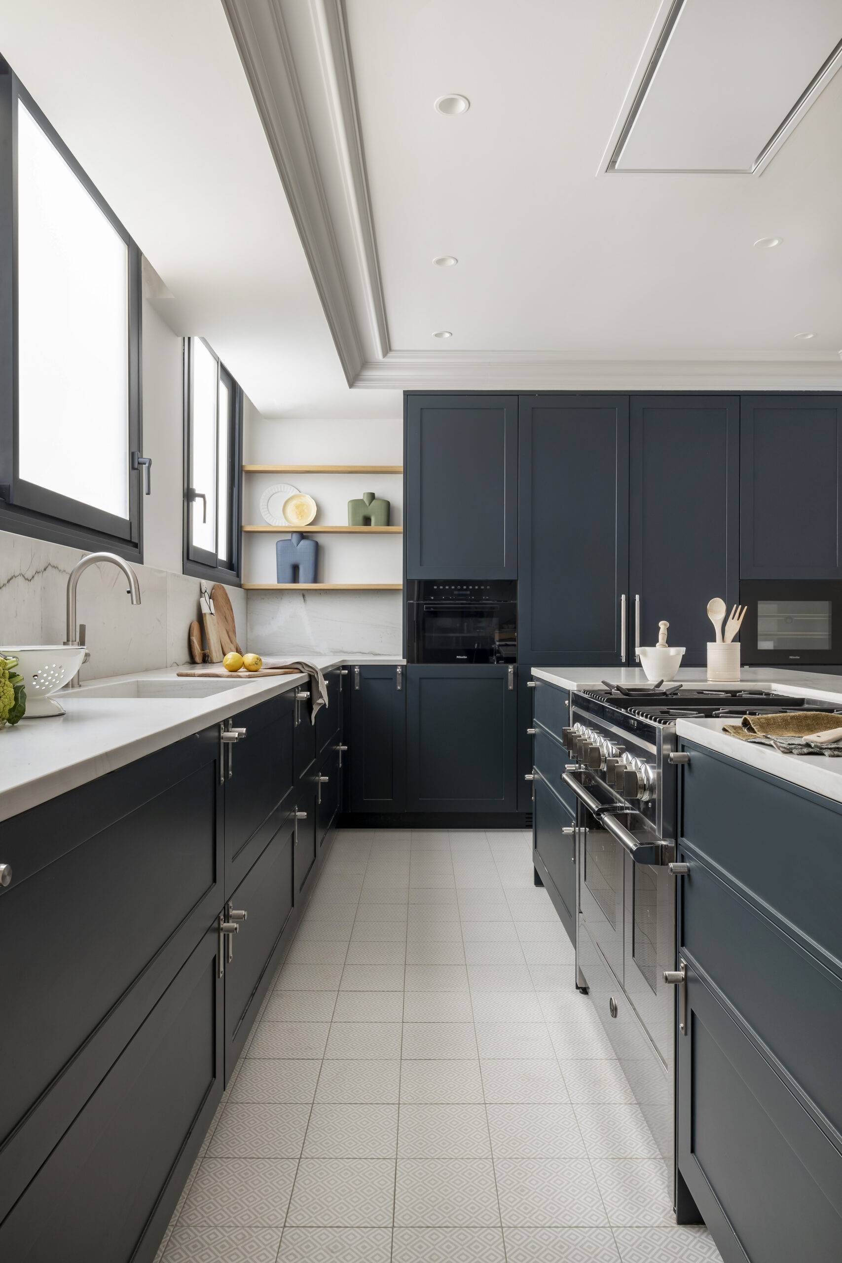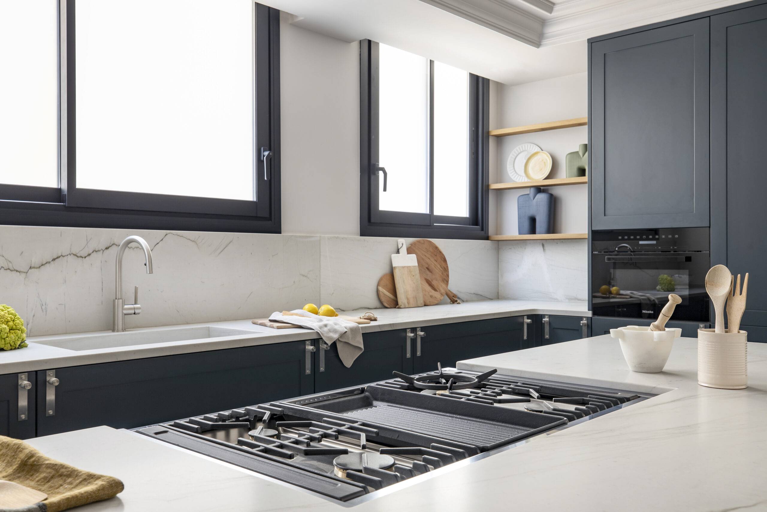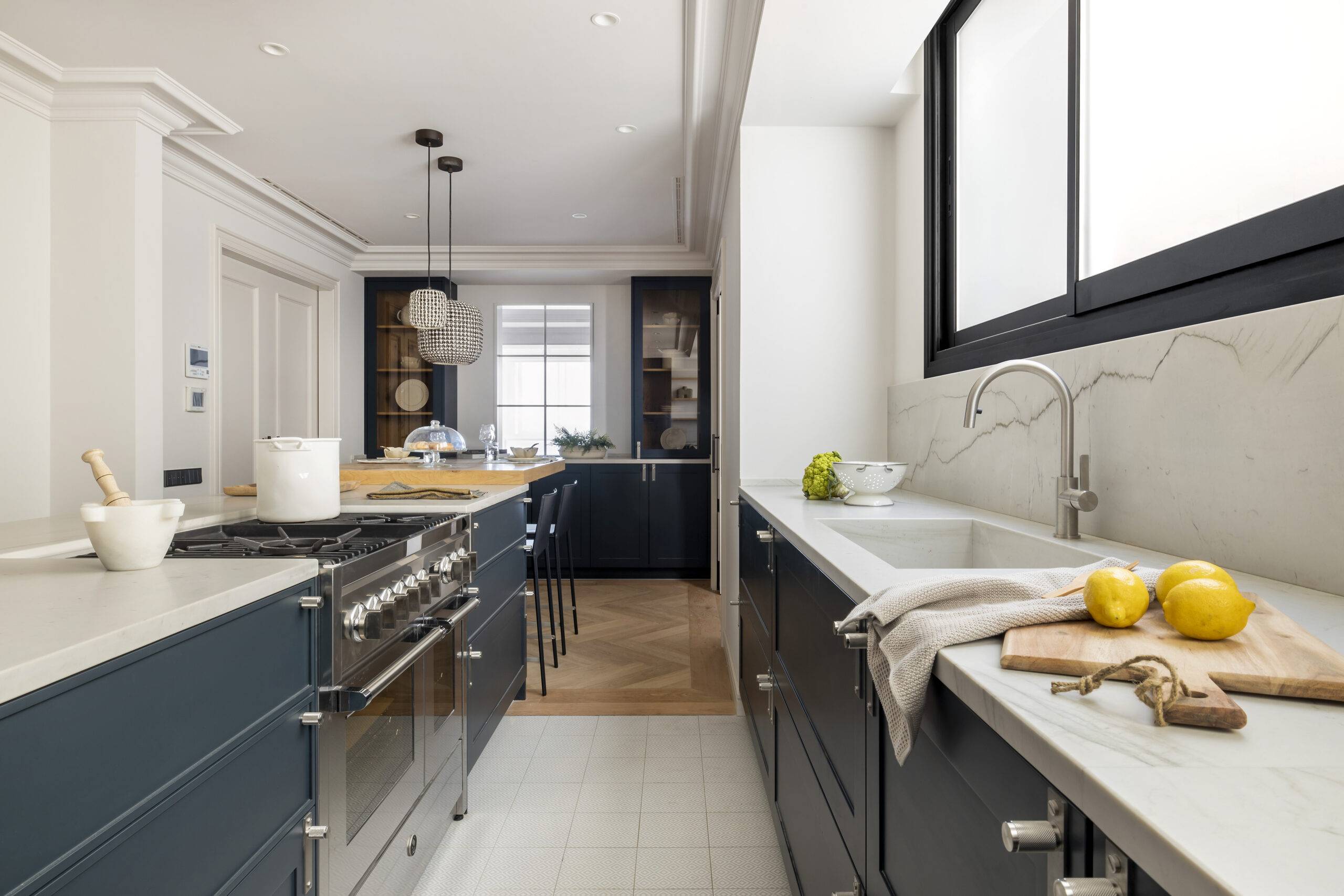 En este proyecto ubicado en Av. Diagonal, Barcelona, nos enfocamos en la cocina, destacada por su sofisticado ambiente atemporal que cautiva emocionalmente, especialmente por su cálido color azul y detalles meticulosamente elaborados.