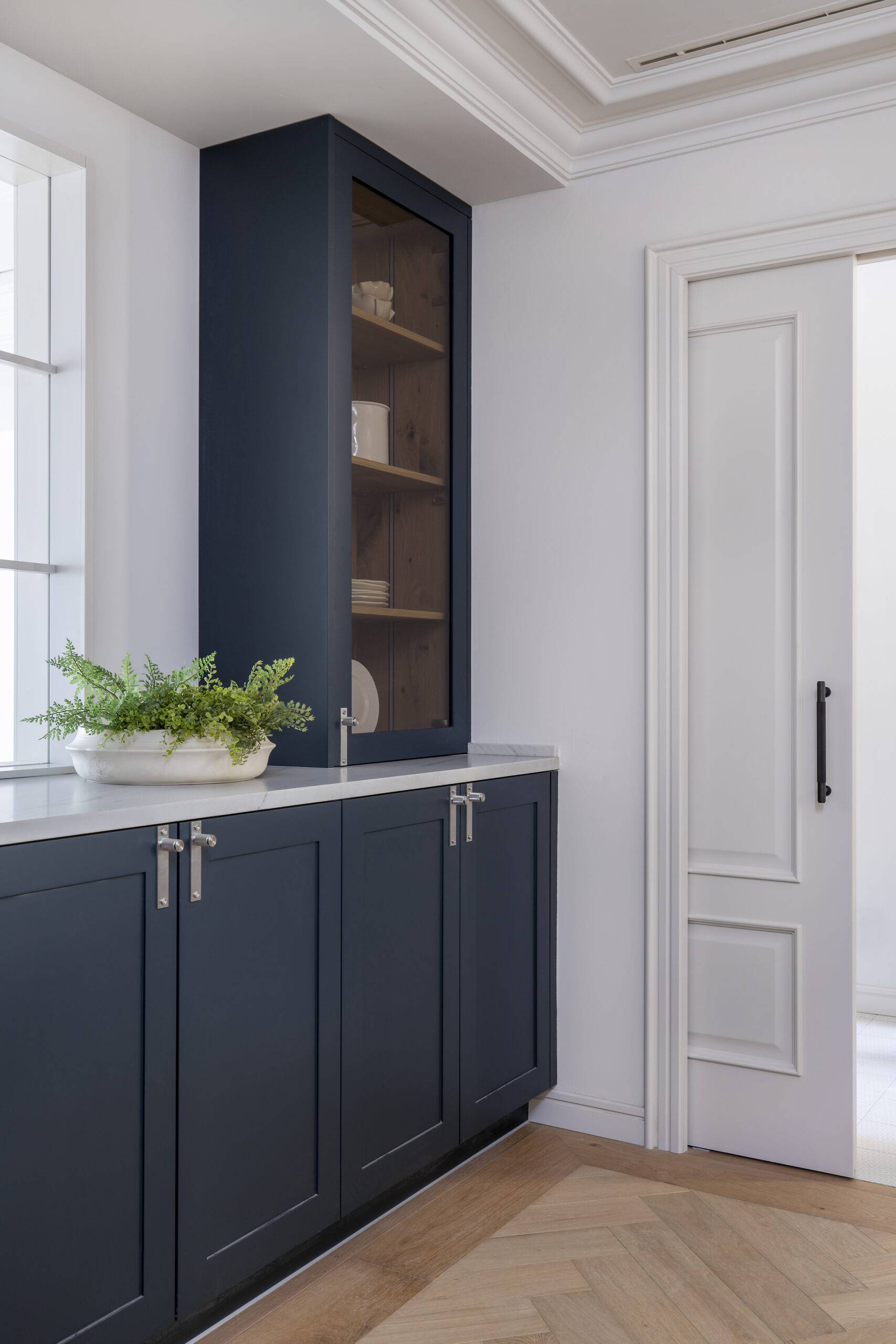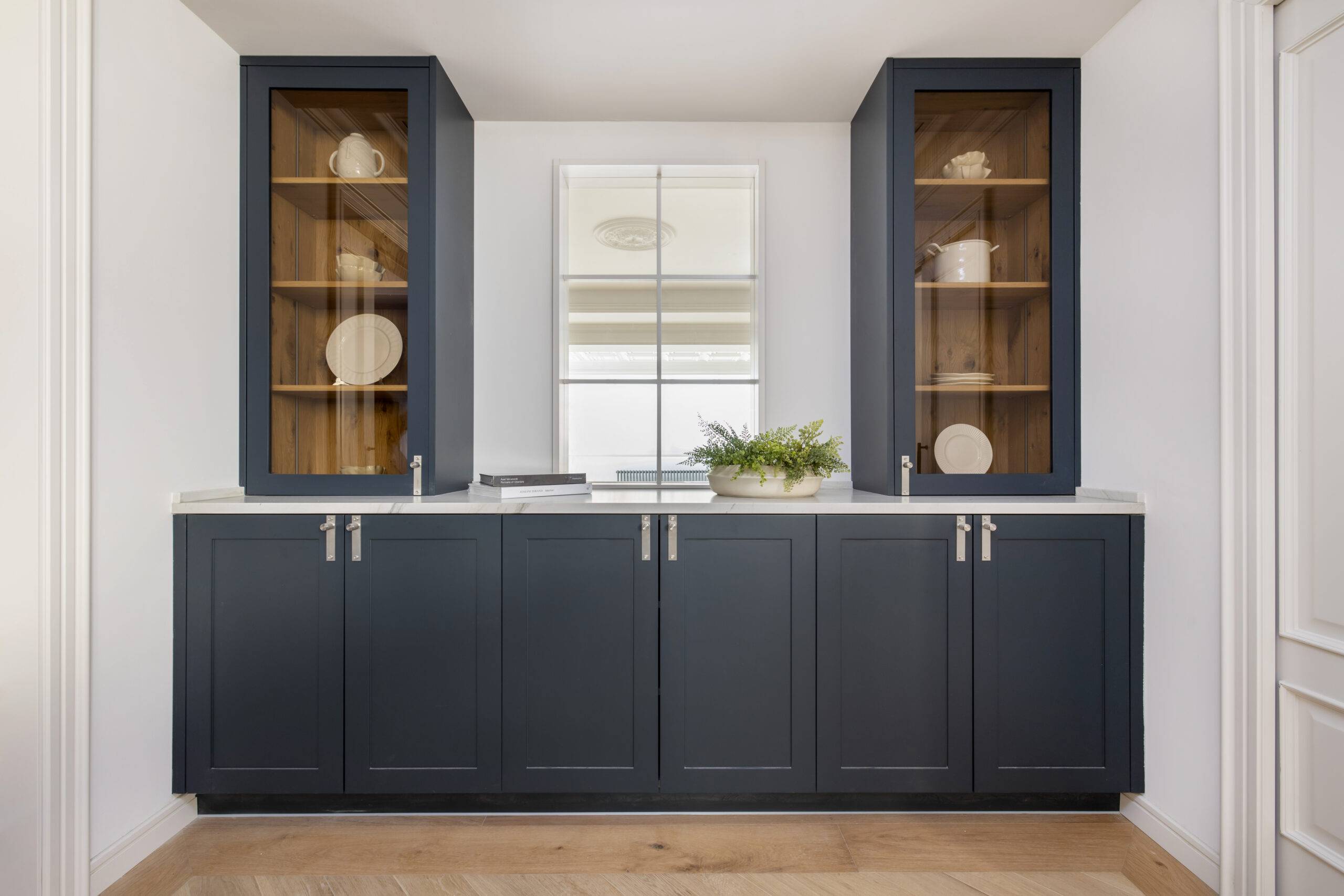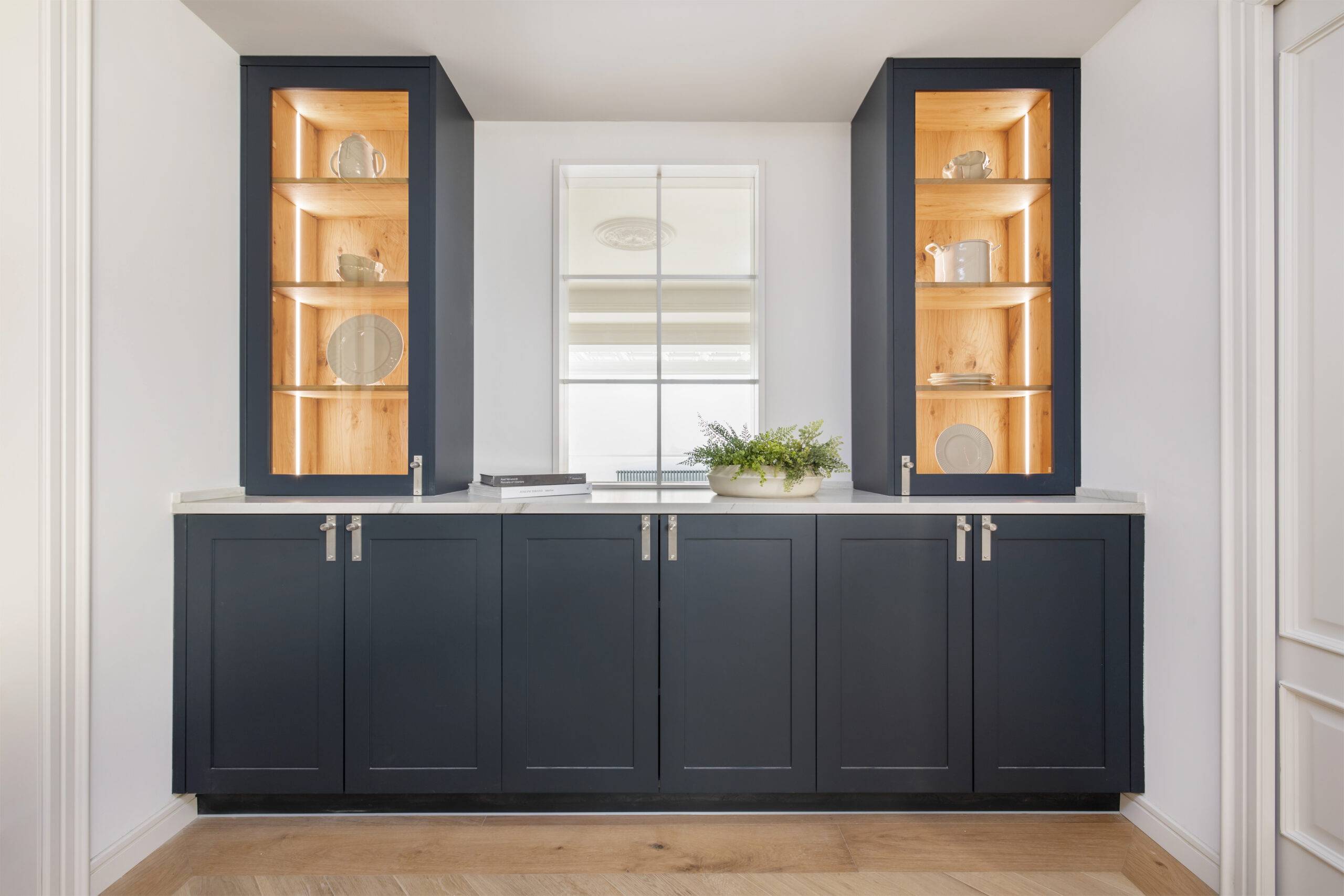 Cada elemento se integra cuidadosamente para ofrecer una atmósfera donde la cocina se convierte en un placer tanto visual como funcional. La calidez se infiltra en el espacio a través de la iluminación integrada en el interior de las vitrinas, generando un contraste notable con el tono azul del mobiliario y el suelo de madera. La luz natural también desempeña un papel esencial, definiendo la estética del ambiente de manera estratégica.