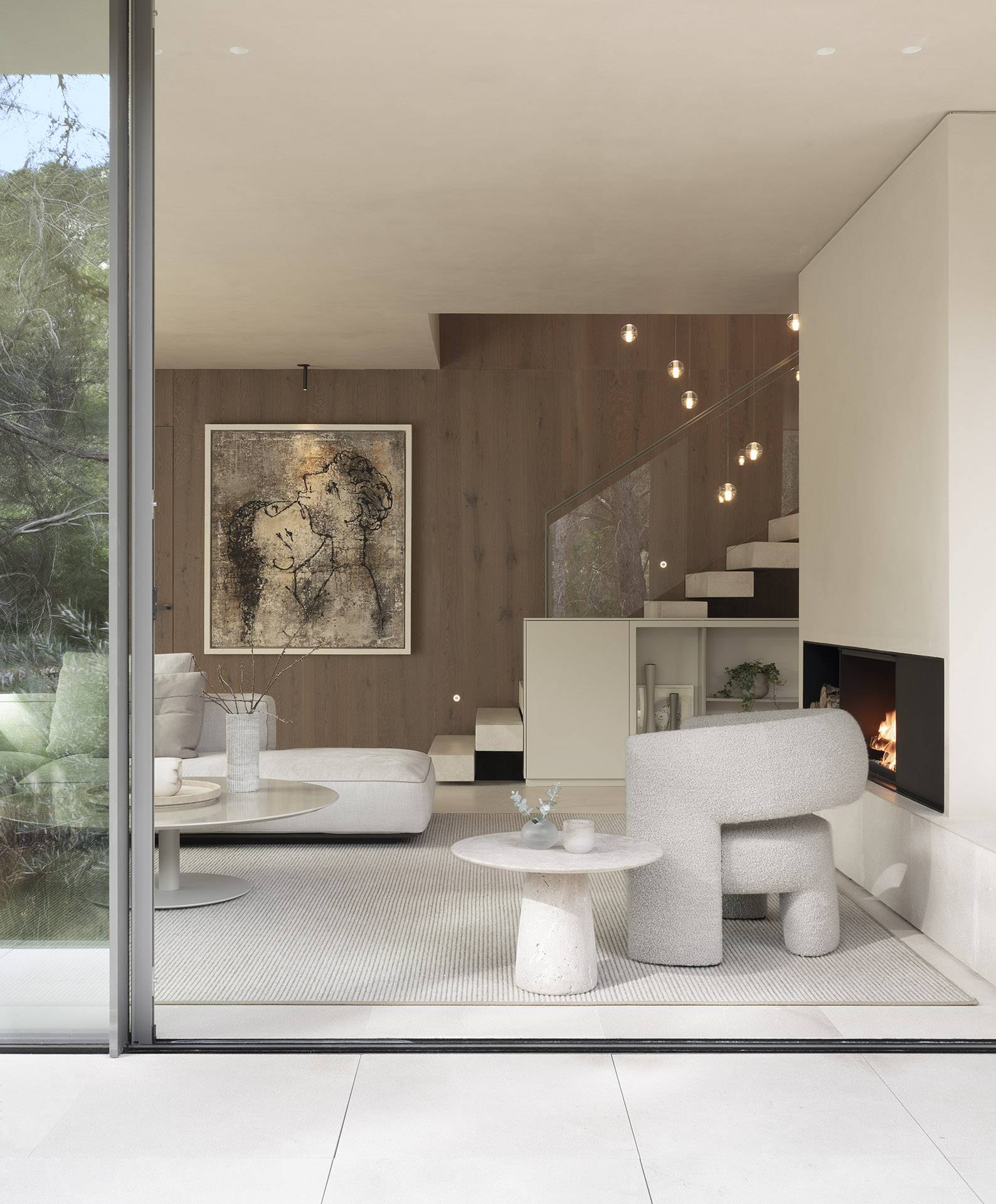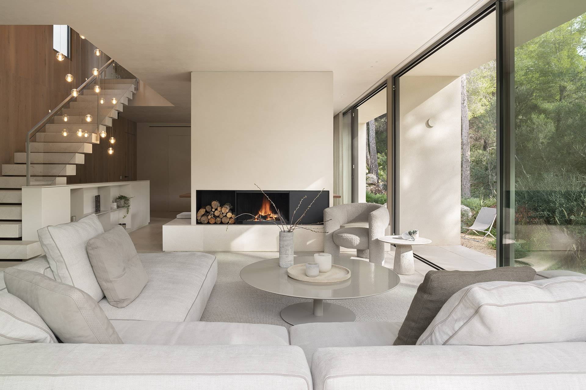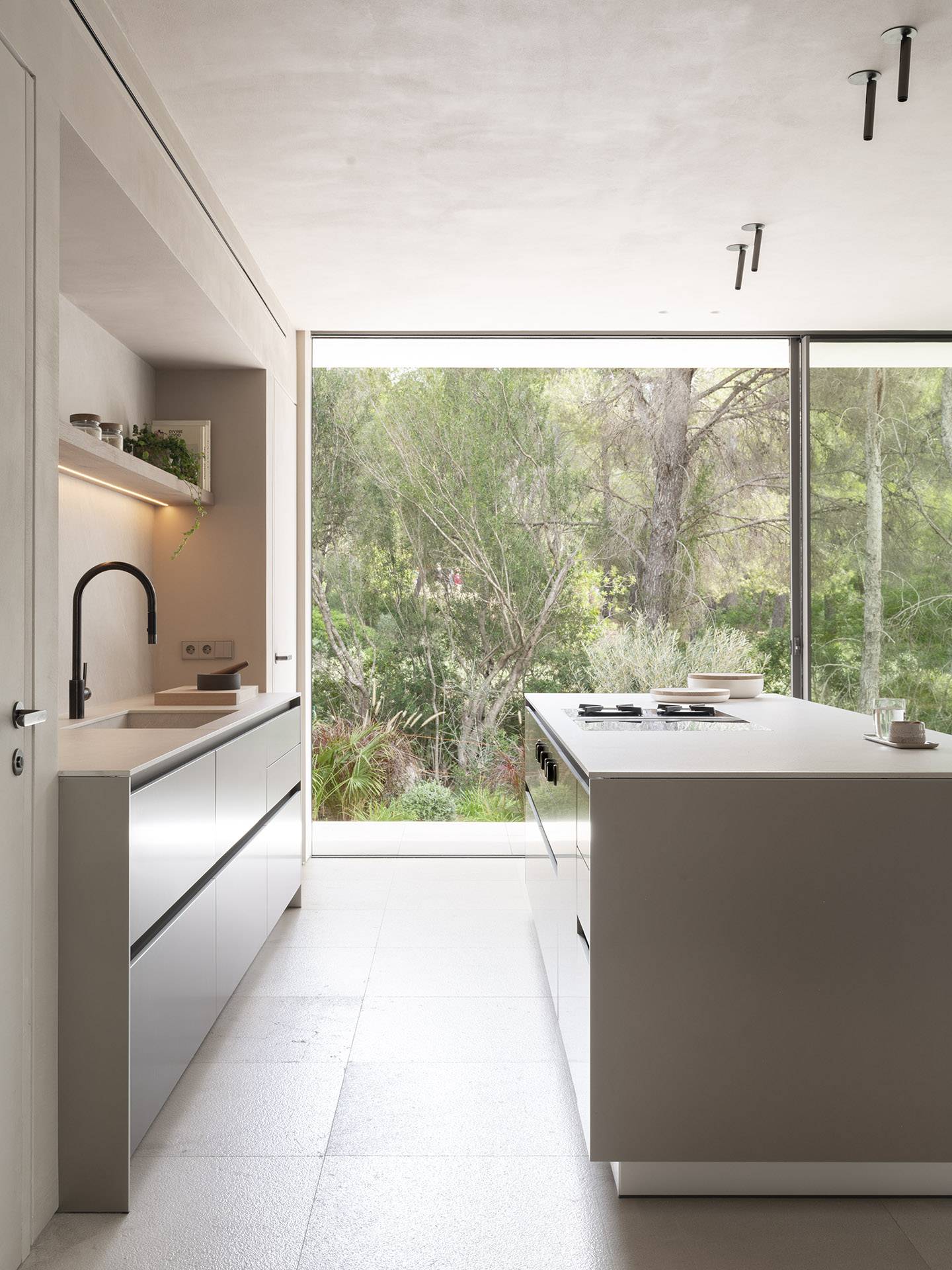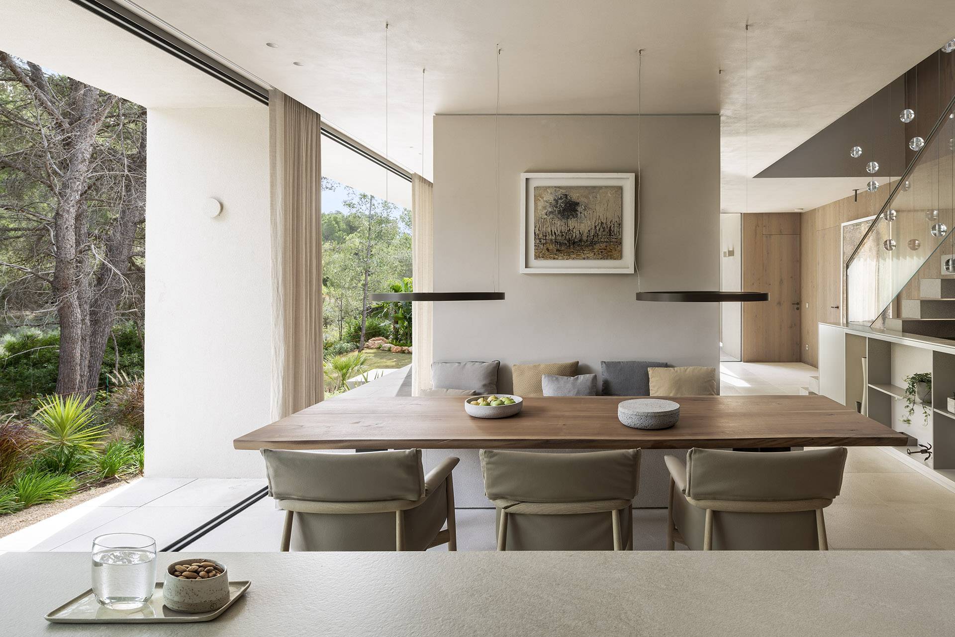 En el centro de esta vivienda, el diseño innovador del arquitecto Joan Miquel Seguí fusiona la geometría con el entorno natural. La villa ofrece espacios interiores elegantes y simples, con mucha luz natural que ilumina la cocina, el salón y el comedor, creando un ambiente tranquilo para la vida diaria.