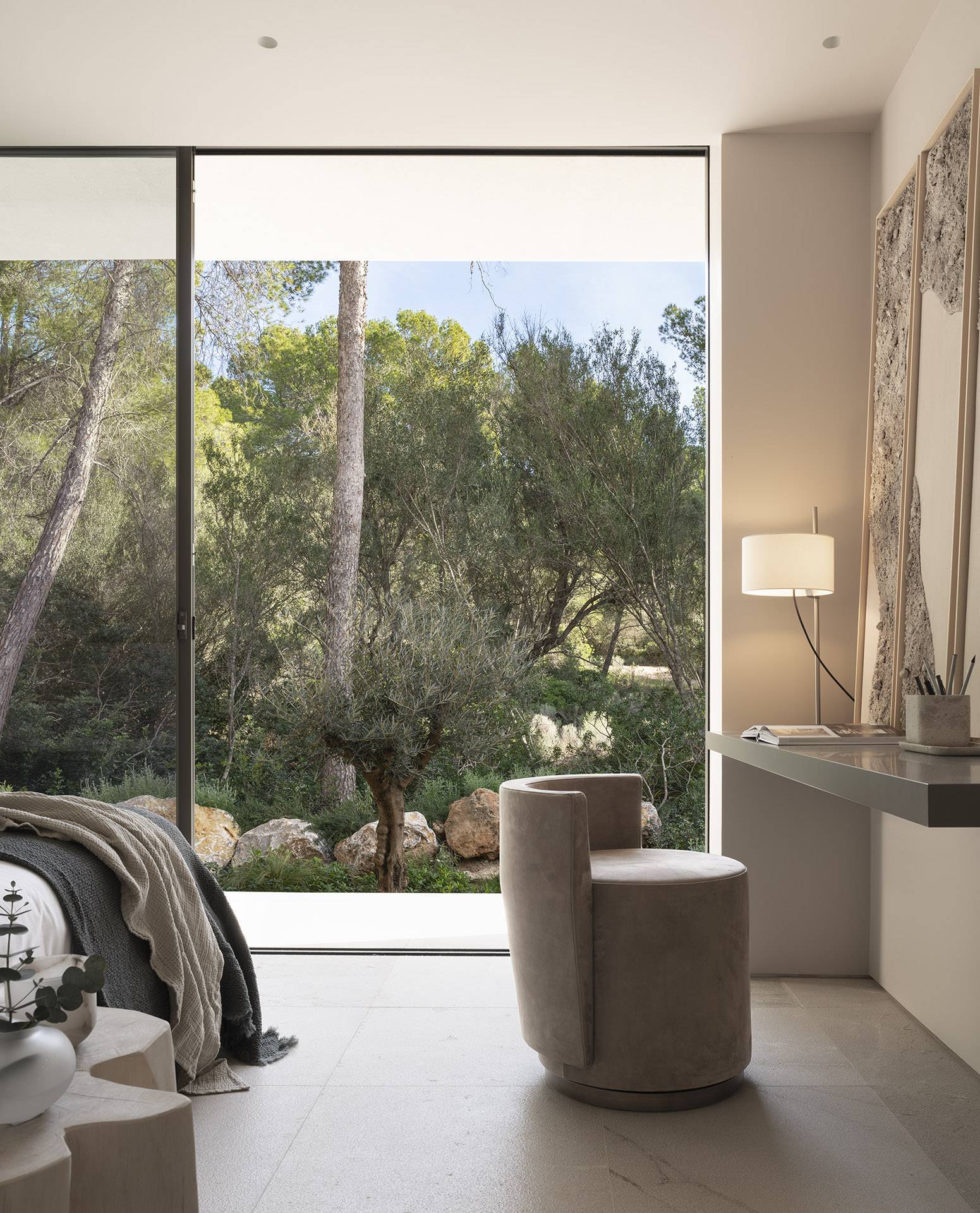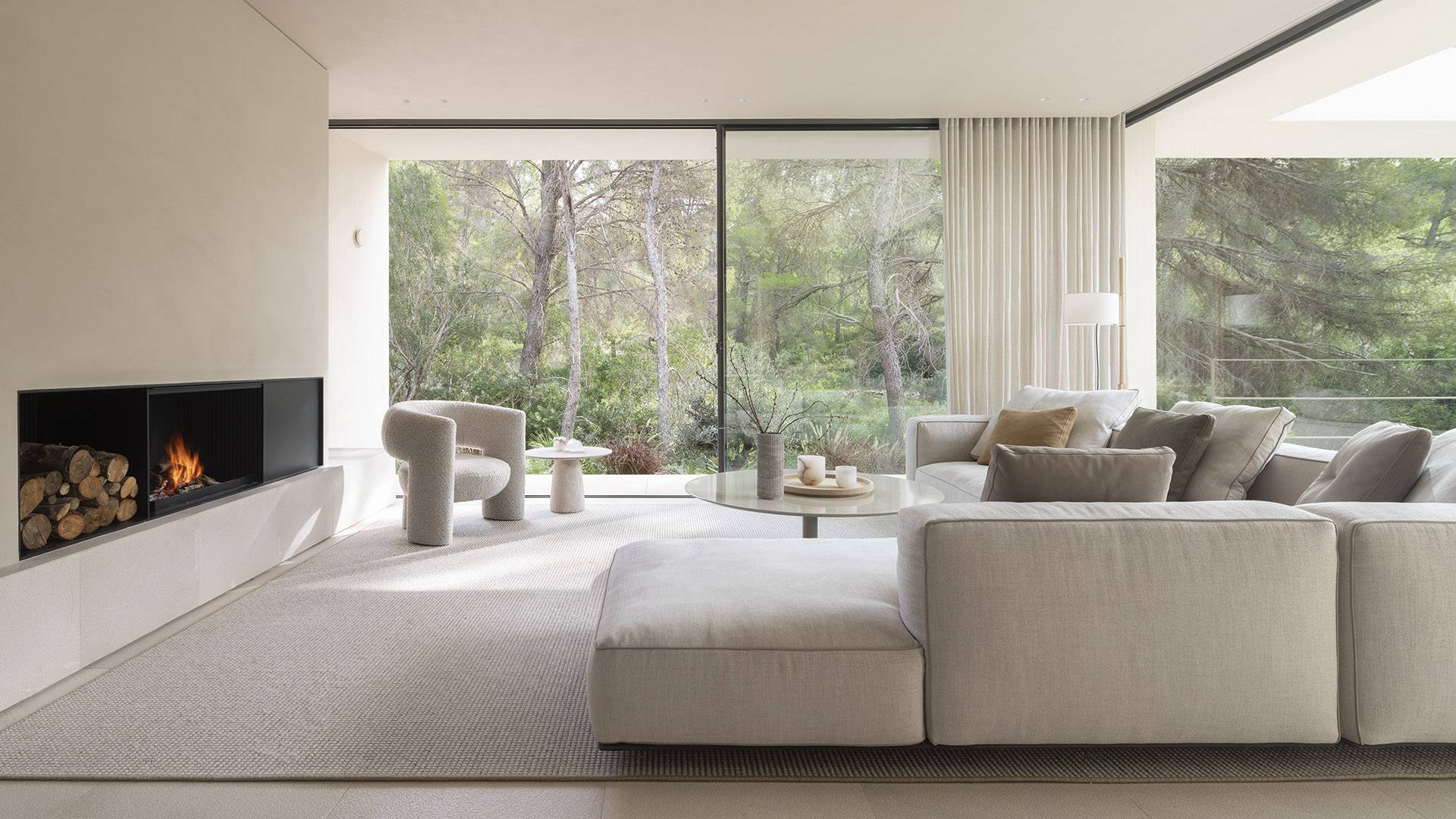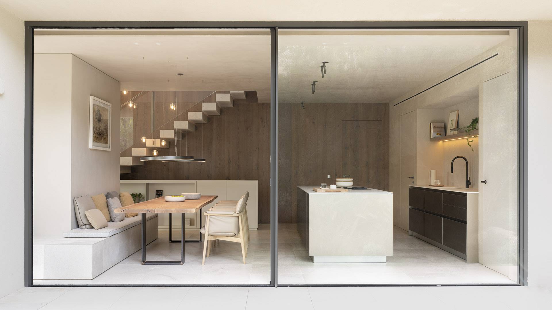 En el centro de esta vivienda, el diseño innovador del arquitecto Joan Miquel Seguí fusiona la geometría con el entorno natural. La villa ofrece espacios interiores elegantes y simples, con mucha luz natural que ilumina la cocina, el salón y el comedor, creando un ambiente tranquilo para la vida diaria.