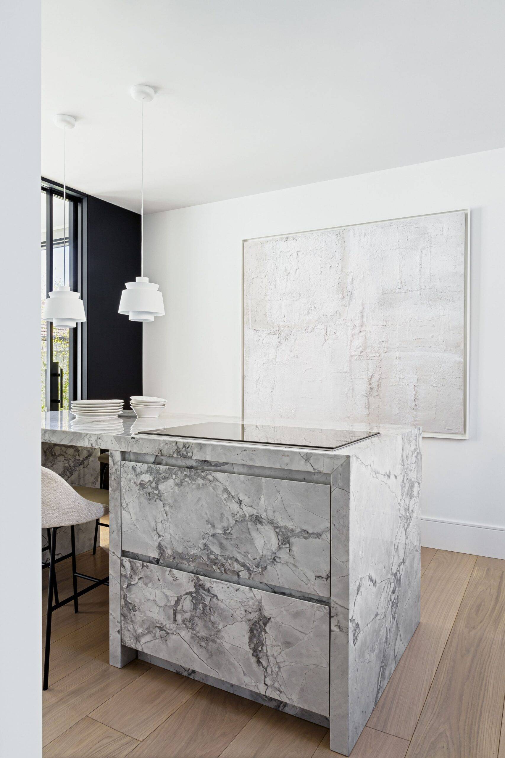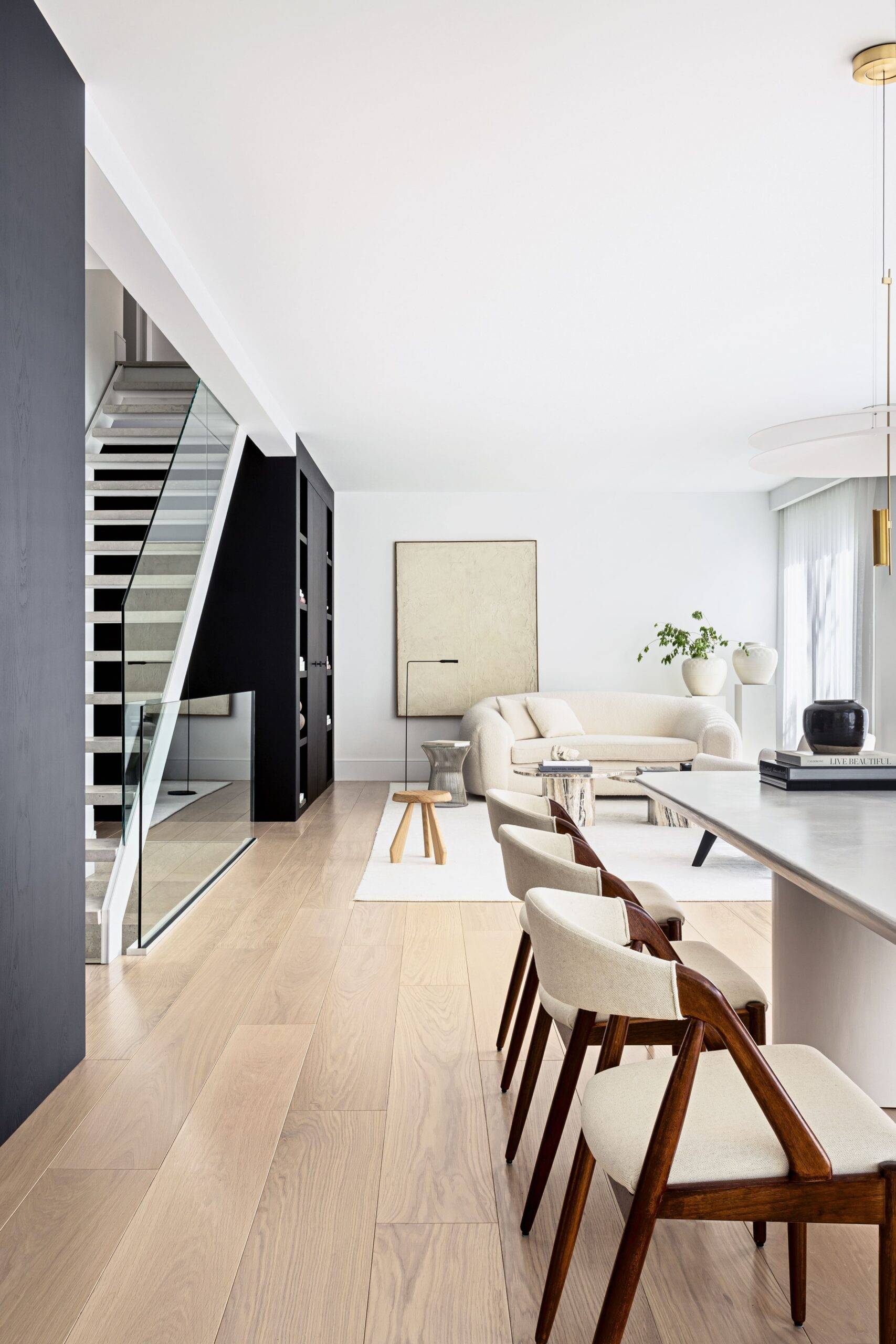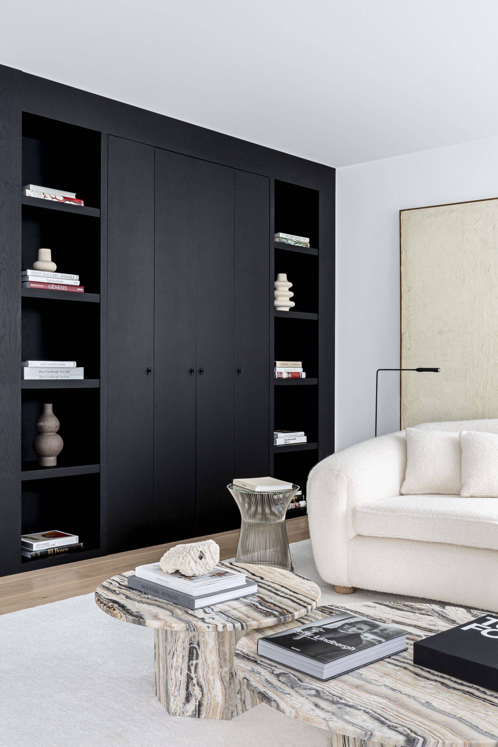 El estudio, desde la fase intermedia de la construcción, ha diseñado el interior de esta vivienda partiendo desde cero. Su visión incluyó la creación de una base arquitectónica limpia y contemporánea, sobre la cual se introdujeron dos cajas de madera negra para organizar el espacio y agregar profundidad. Esta elección audaz, alejándose del esquema total White, infundió al ambiente con carácter y personalidad únicos.