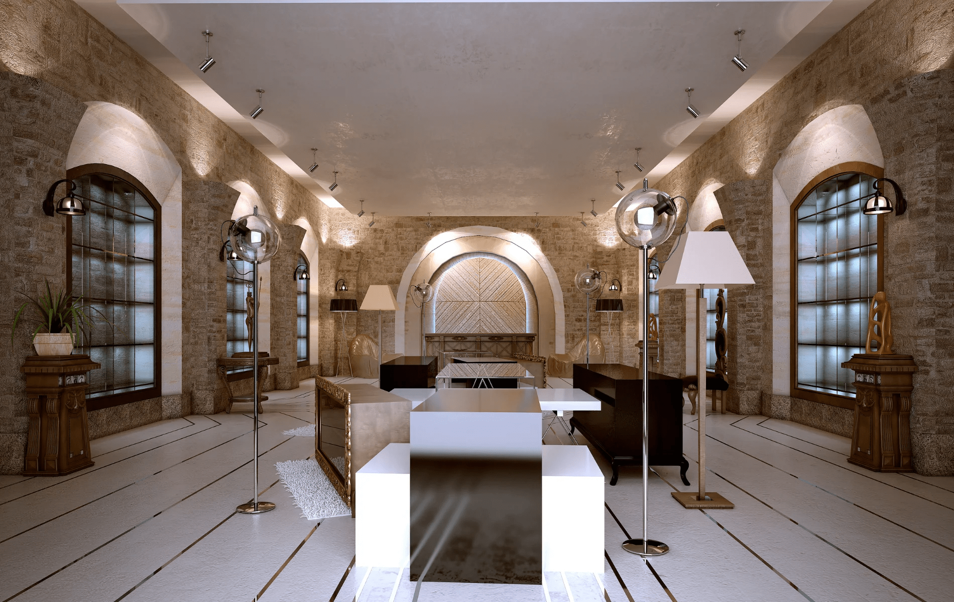 Iluminación dramática: Las lámparas colgantes con diseños elaborados o apliques de pared con acabados dorados pueden añadir un toque de drama y elegancia al espacio.