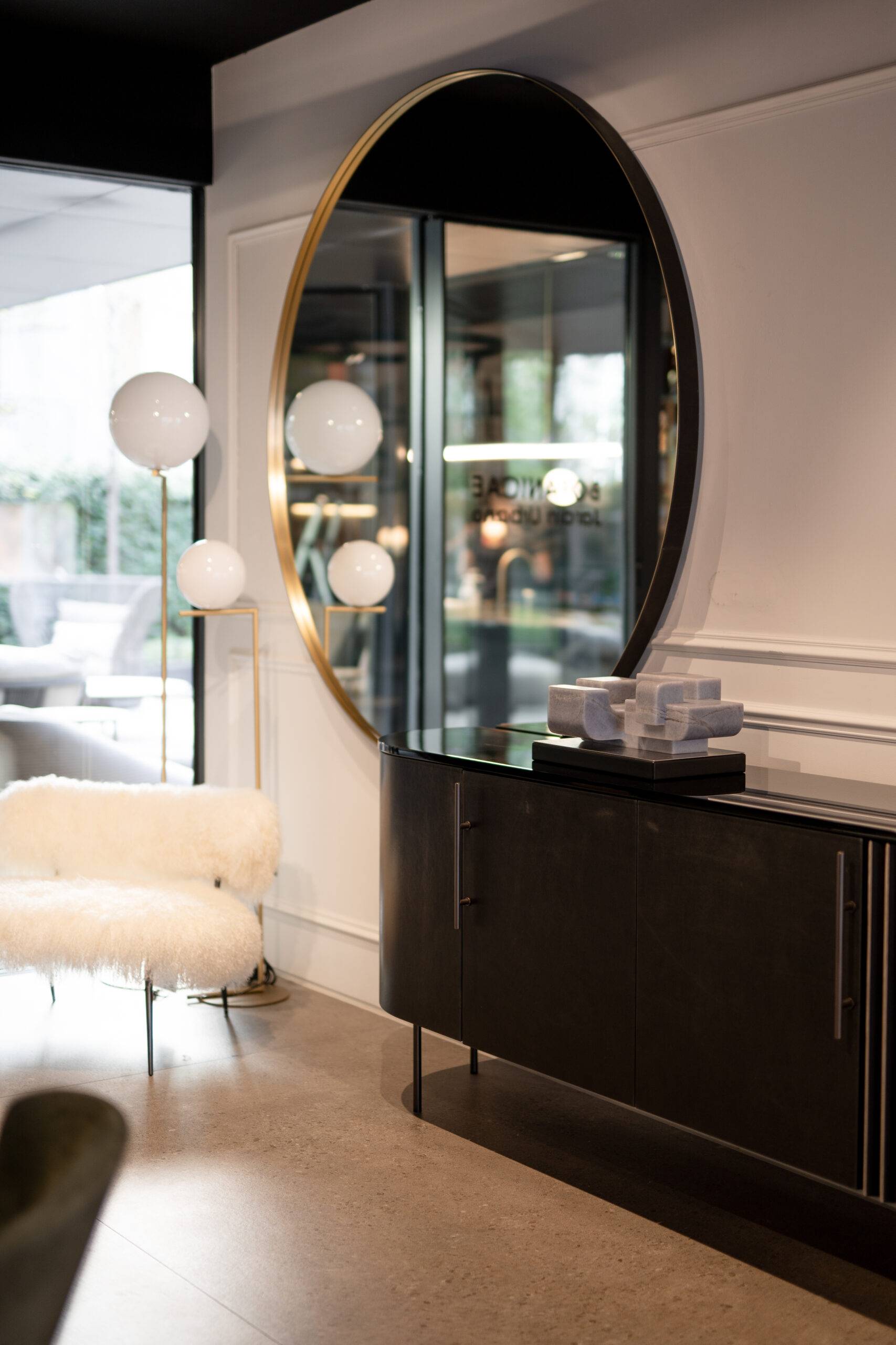 El espejo Marlene, presenta una estructura de contrachapado de álamo teñido en negro mate. Su marco de latón satinado está recubierto de cuero en el exterior, lo que le da un toque elegante y sofisticado.