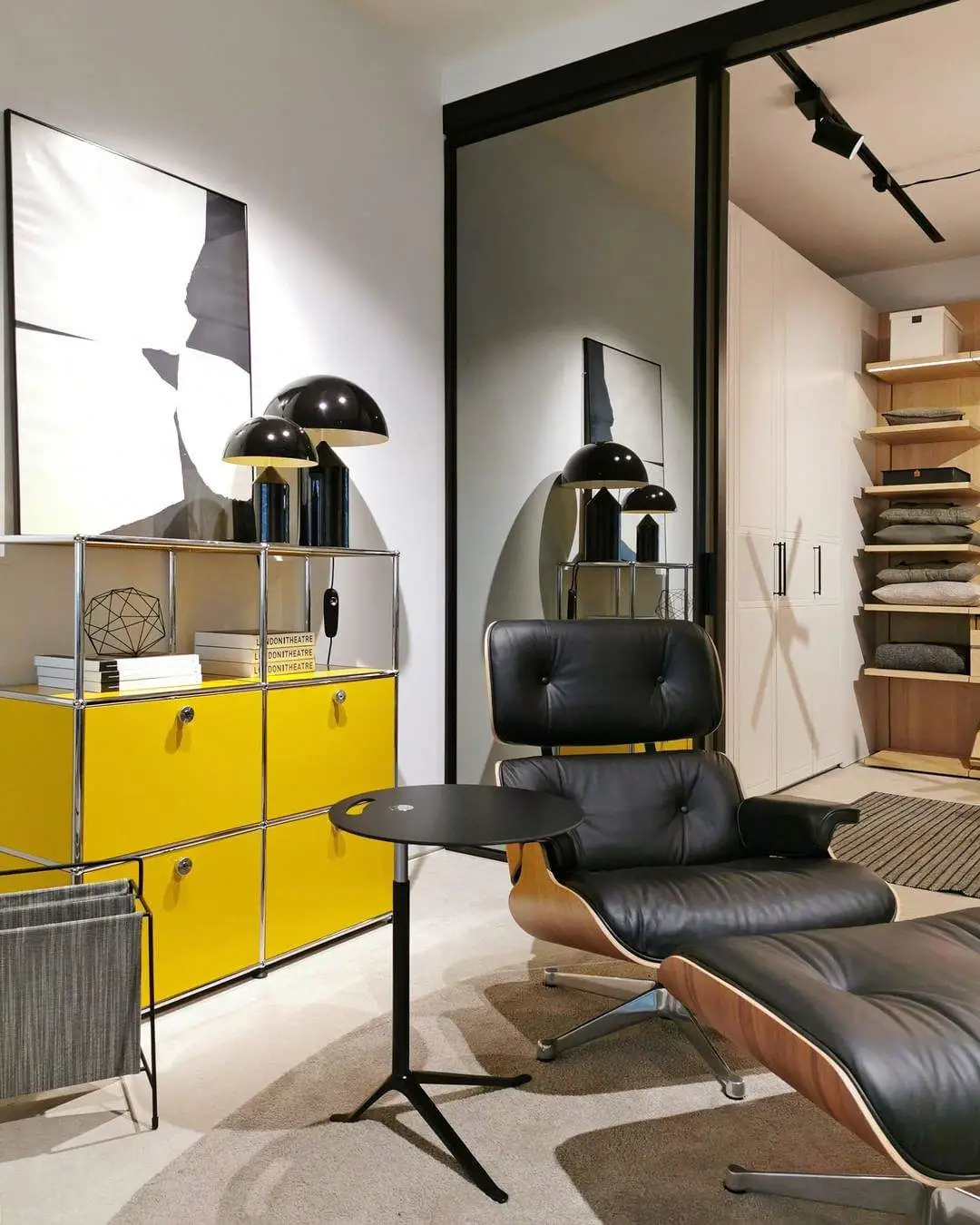 Este rincón dedicado al interiorismo y la relajación se asienta sobre piezas icónicas del diseño contemporáneo (la Eames Lounge Chair de Vitra resalta por encima del resto), y destaca por el uso del amarillo como tono que rompe la homogeneidad de la composición.
