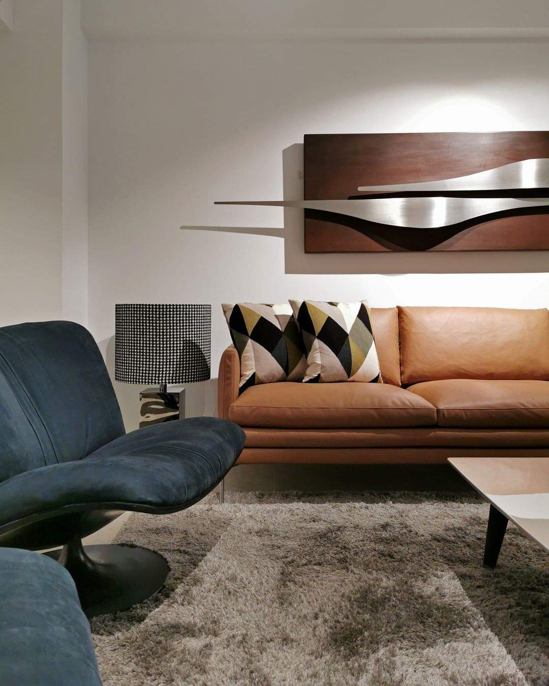 Una combinación de diferentes texturas hacen de este salón un espacio original y relajado: el aterciopelado de las butacas, el cuero marrón del sofá principal y el pelo alto de la alfombra generan un juego de sensaciones únicas que se completa con la inclusión de obras de arte y piezas de diseño.