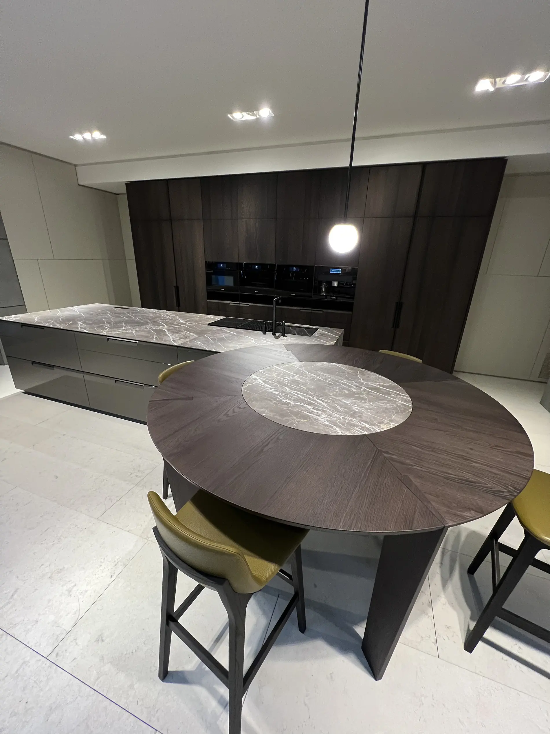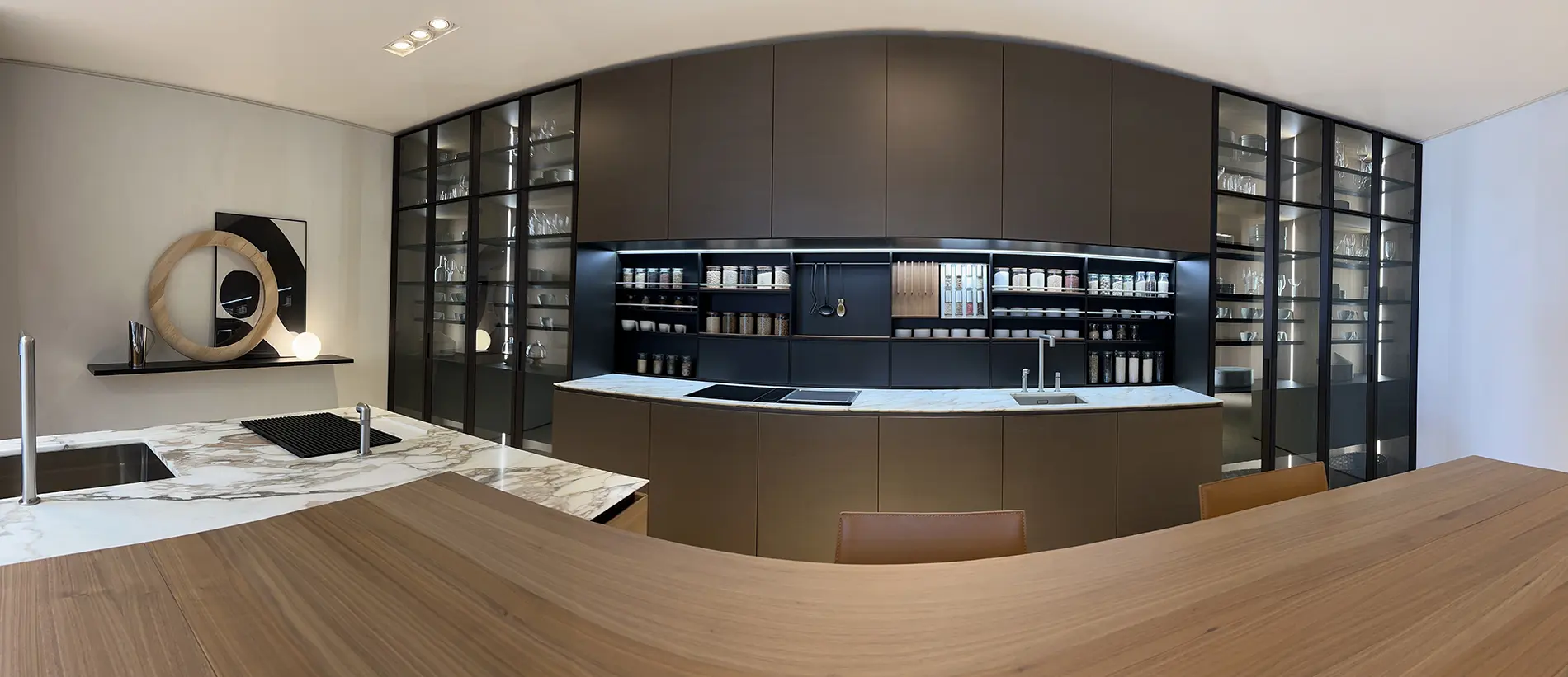 En Gunni&Trentino seguimos las tendencias y en nuestro Showroom de muebles de lujo en Madrid hemos expuesto la siguiente cocina con isla redondeada, dotando así de una mayor elegancia nuestro espacio. Nuestro equipo de expertos te asesorará en todo momento durante la elección de los muebles de cocina modernos o clásicos y podrá realizar un proyecto completo de decoración que incluya no sólo mobiliario y electrodomésticos de cocina sino también pavimentos, revestimientos, iluminacióny mobiliario de hogar para crear un ambiente integral adaptado a su modo de vida.