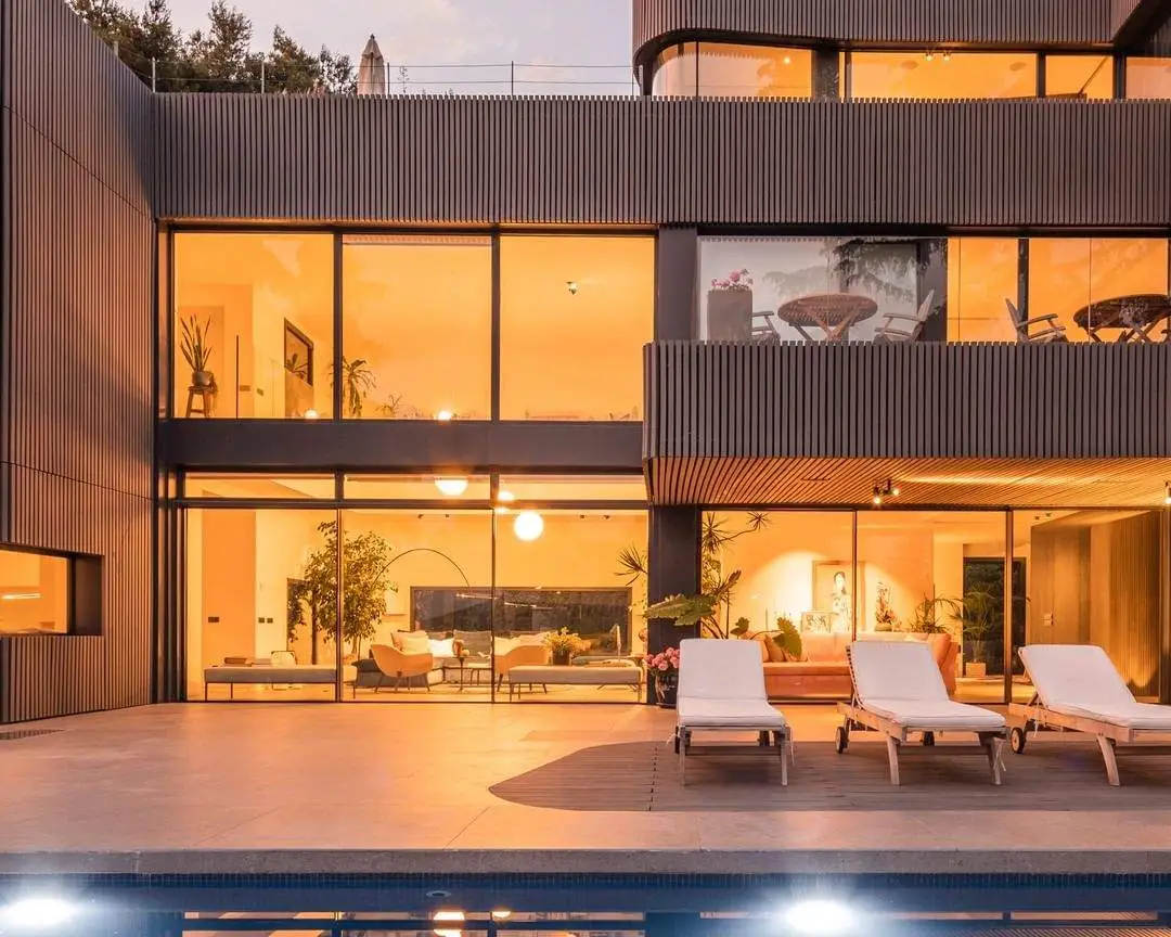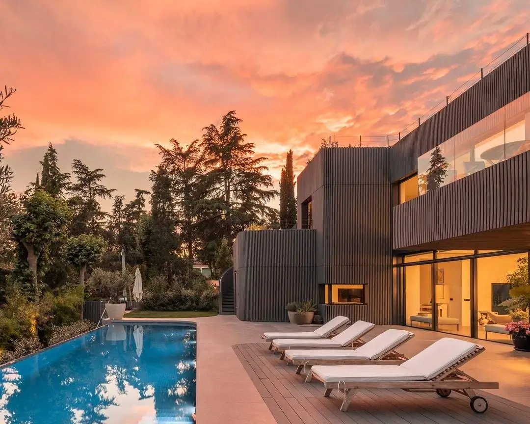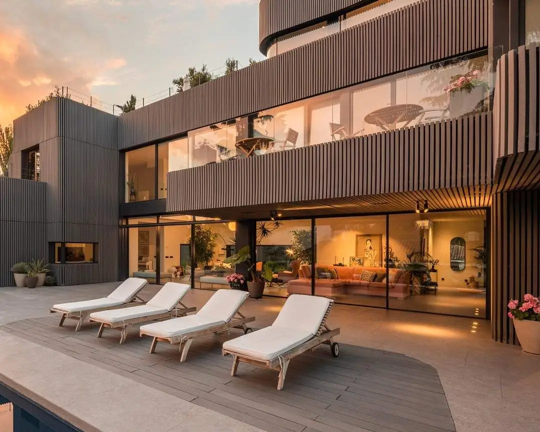 Una selección de materiales exclusivos para exteriores, entre los que destacamos el porcelánico y la madera, suponen el lienzo para esta vivienda de diseño.
