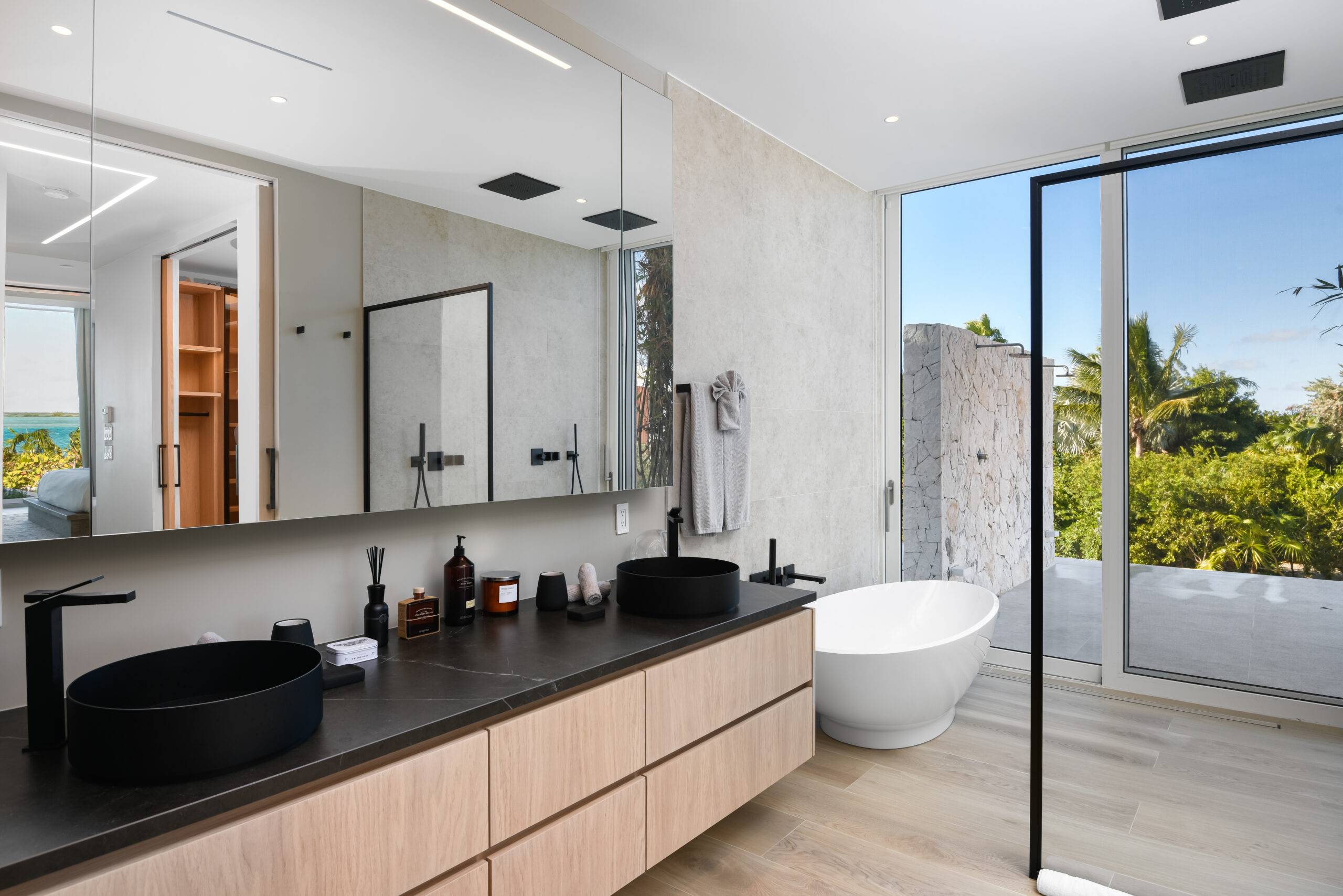 En la zona social, la piscina infinita se convierte en el epicentro de la diversión y el entretenimiento, rodeada de tumbonas y muebles de exterior de alta calidad para relajarse y disfrutar del sol. En el dormitorio principal, también ubicado en esta planta, se han diseñado dos vestidores y un baño de lujo con dos duchas interiores y una bañera exterior, para disfrutar de un baño relajante con vistas al mar. El lujo y el confort son los principales objetivos en esta villa, y cada detalle ha sido meticulosamente considerado para crear un espacio perfecto en el paraíso de Turcks&Caicos.